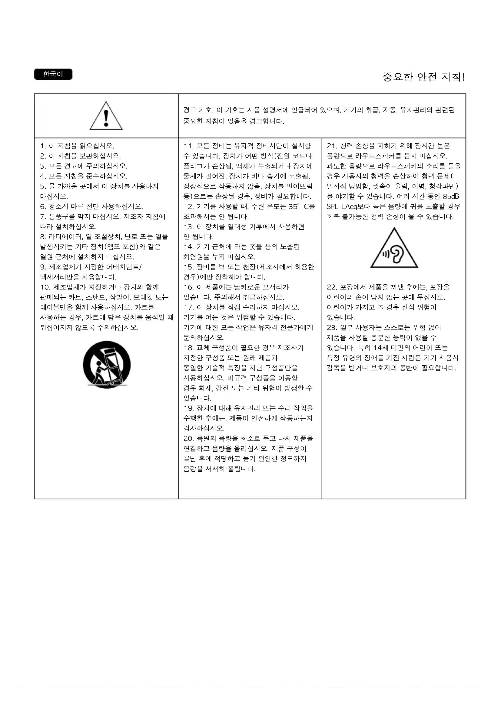 음량으로 라우드스피커를 듣지 마십시오. 과도한 음량으로 라우드스피커의 소리를 들을 경우 사용자의 청력을 손상하여 청력 문제( 일시적 멍멍함, 귓속이 울림, 이명, 청각과민) 를 야기할 수 있습니다. 여러 시간 동안 85dB SPL-LAeq보다 높은 음량에 귀를 노출할 경우 회복 불가능한 청력 손상이 올 수 있습니다.