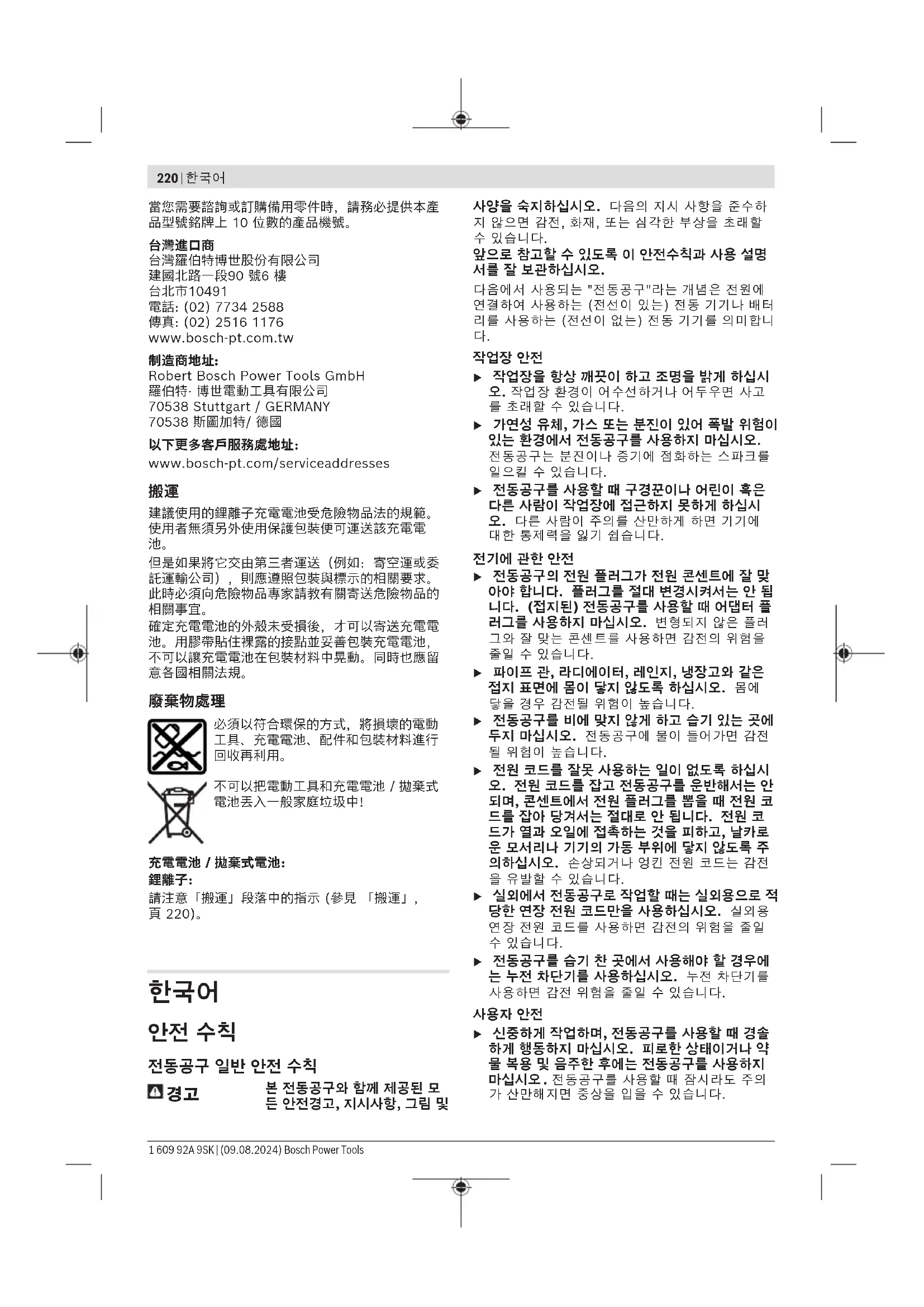 u 기술자료에 기재되어 있는 충전기만 사용하십시 오. 귀하의 전동공구에 사용된 리튬이온 배터리 에 맞춰진 충전기들입니다. 지침: 리튬 이온 배터리는 국제 운송 규정에 따라 일부만 충전되에 출고됩니다. 배터리의 성능을 완 전하게 보장하기 위해서는 처음 사용하기 전에 배 터리를 완전히 충전하십시오. Bosch Power Tools 1 609 92A 9SK | (09.08.2024)224 | 한국어
