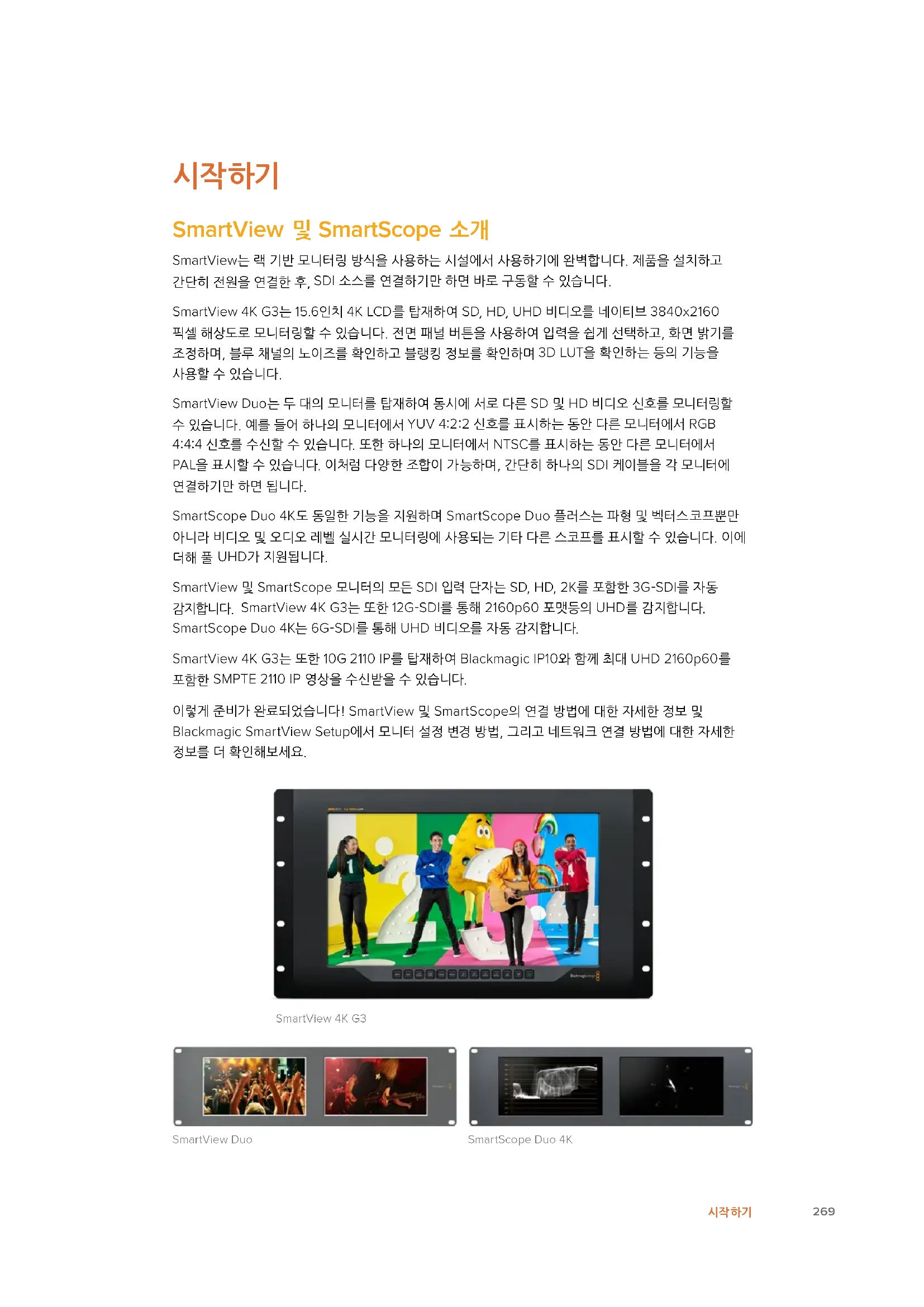 BlackmagicSmartViewSetup사용하기SmartView4KG3사용하기 SmartView 4K G3는 SD, HD 및 최대 2160p60 UHD 비디오의 네이티브 뷰를 지원하는 6랙 유닛