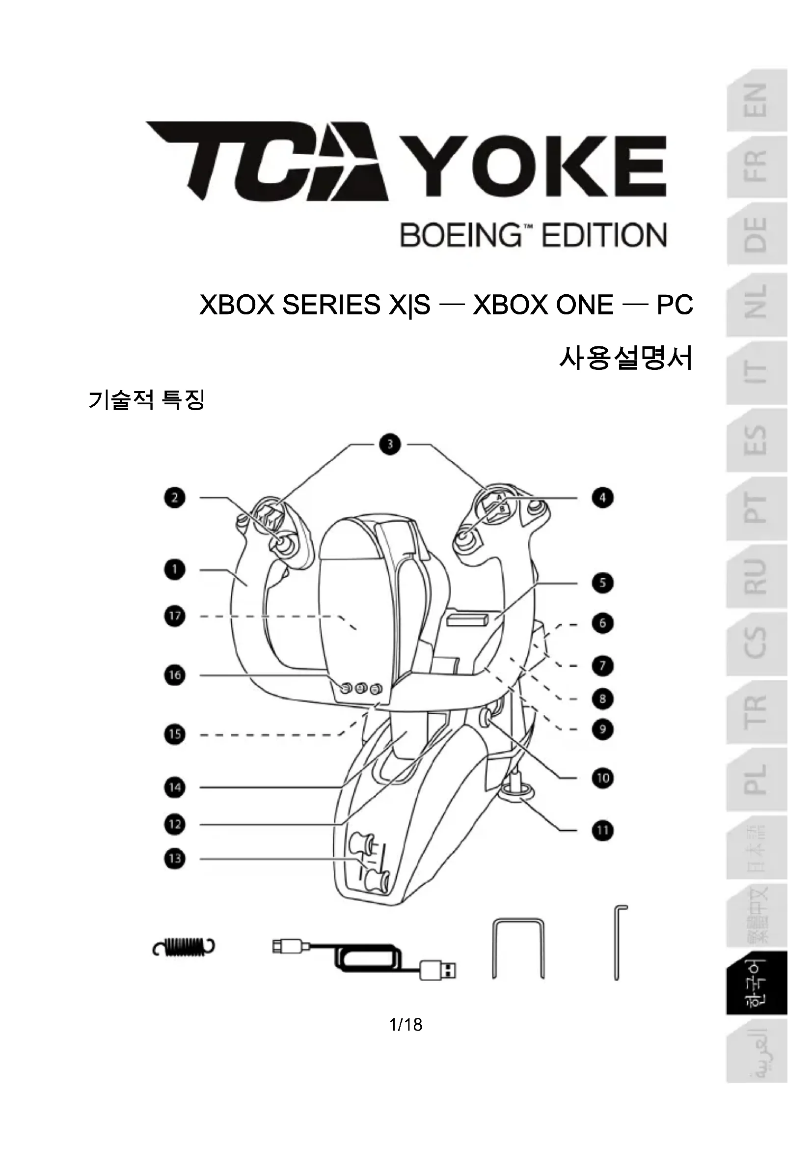 이 조종간과 호환 가능한 Xbox Series X|S / Xbox One 게임 목록은 https://support.thrustmaster.com 의 Joysticks(조이스틱) / TCA Yoke Boeing Edition 섹션에서 확인하실 수 있습니다. 이 목록은 TCA Yoke Boeing Edition 과 호환 가능한 신규 Xbox Series X|S / Xbox One 게임이 출시되면 정기적으로 추가됩니다.4/18