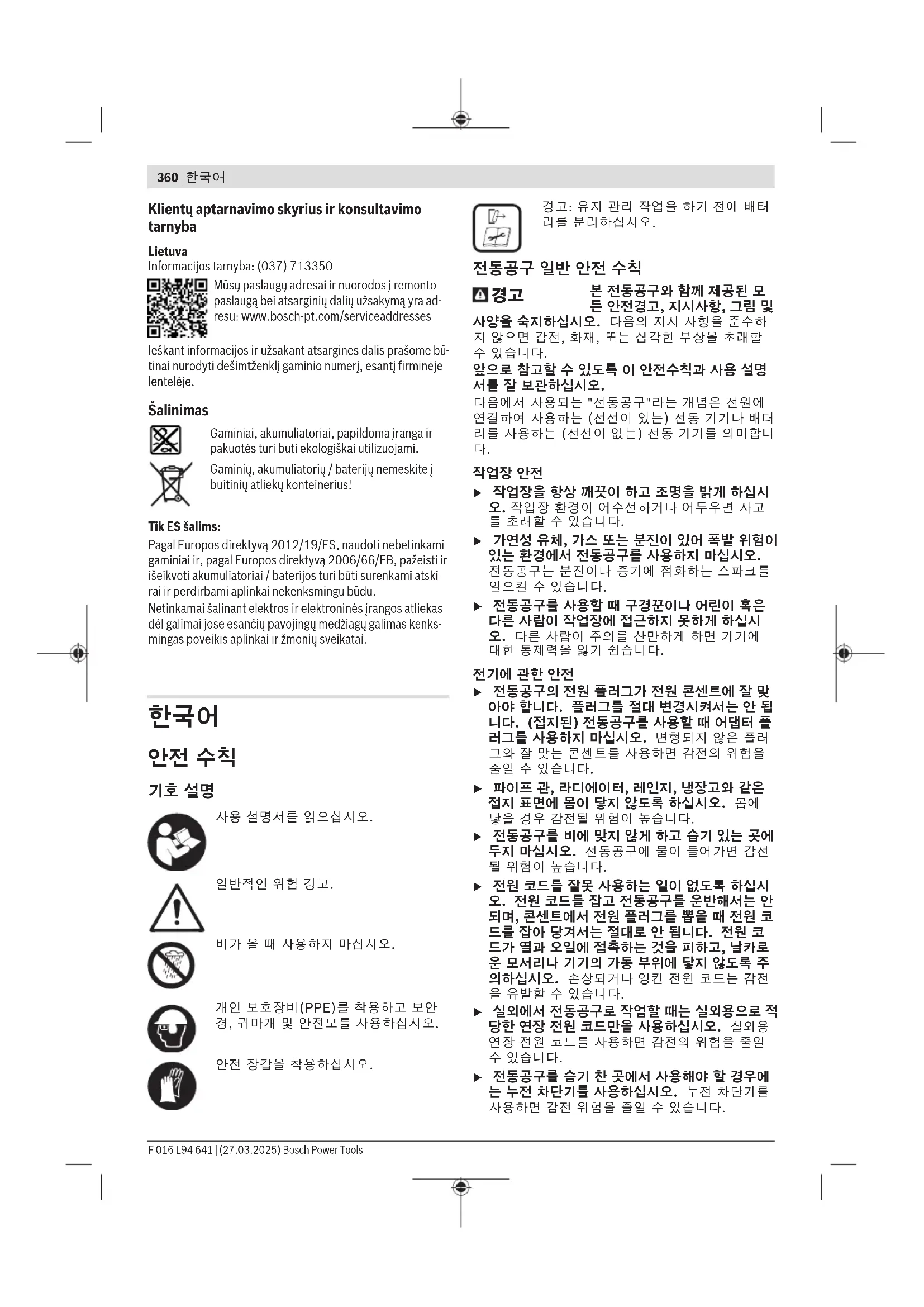 u 전동공구를 습기 찬 곳에서 사용해야 할 경우에 는 누전 차단기를 사용하십시오. 누전 차단기를 사용하면 감전 위험을 줄일 수 있습니다. F 016 L94 641 | (27.03.2025) Bosch Power Tools한국어 | 361