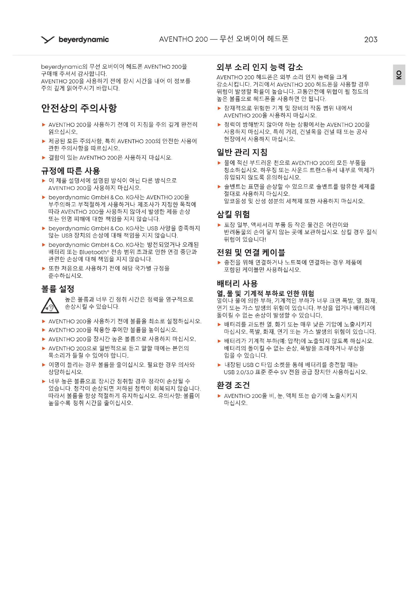 안전상의 주의사항 203 규정에 따른 사용 203 볼륨 설정 203 일반 관리 지침 203 삼킬 위험 203 전원 및 연결 케이블 203 배터리 사용 203 환경 조건 203 본 설명서 정보 204 제공 범위 204 조작 요소 204 배터리 충전 204 리튬 이온 배터리의 수명에 대한 참고 사항 204 충전 상태 표시 204 BEYERDYNAMIC 앱 다운로드 205 재생 장치 호환성 205 지원되는 오디오 코덱 205 조작 205 전원 켜고 끄기 205 Bluetooth®를 통해 장치에 연결 205 페어링 설정 206 다중점 작동 206 다중점 연결 설정 206 다중점 사용 206 페어링 목록 삭제 206 미디어 재생 207 볼륨 조절 207 통화 208 초기 설정으로 리셋 208 조작 기능 개요 208 헤드폰의 LED 표시 개요 209 오디오 케이블 연결 209 청소 209 이어패드 교체하기 209 배터리 교체 210 문제 해결 210 문제 해결/FAQ 211 제품 등록 211 폐기 211 배터리 폐기 211 EU 적합성 선언 211 기술 자료 211 보증 조건 211 등록 상표 211203