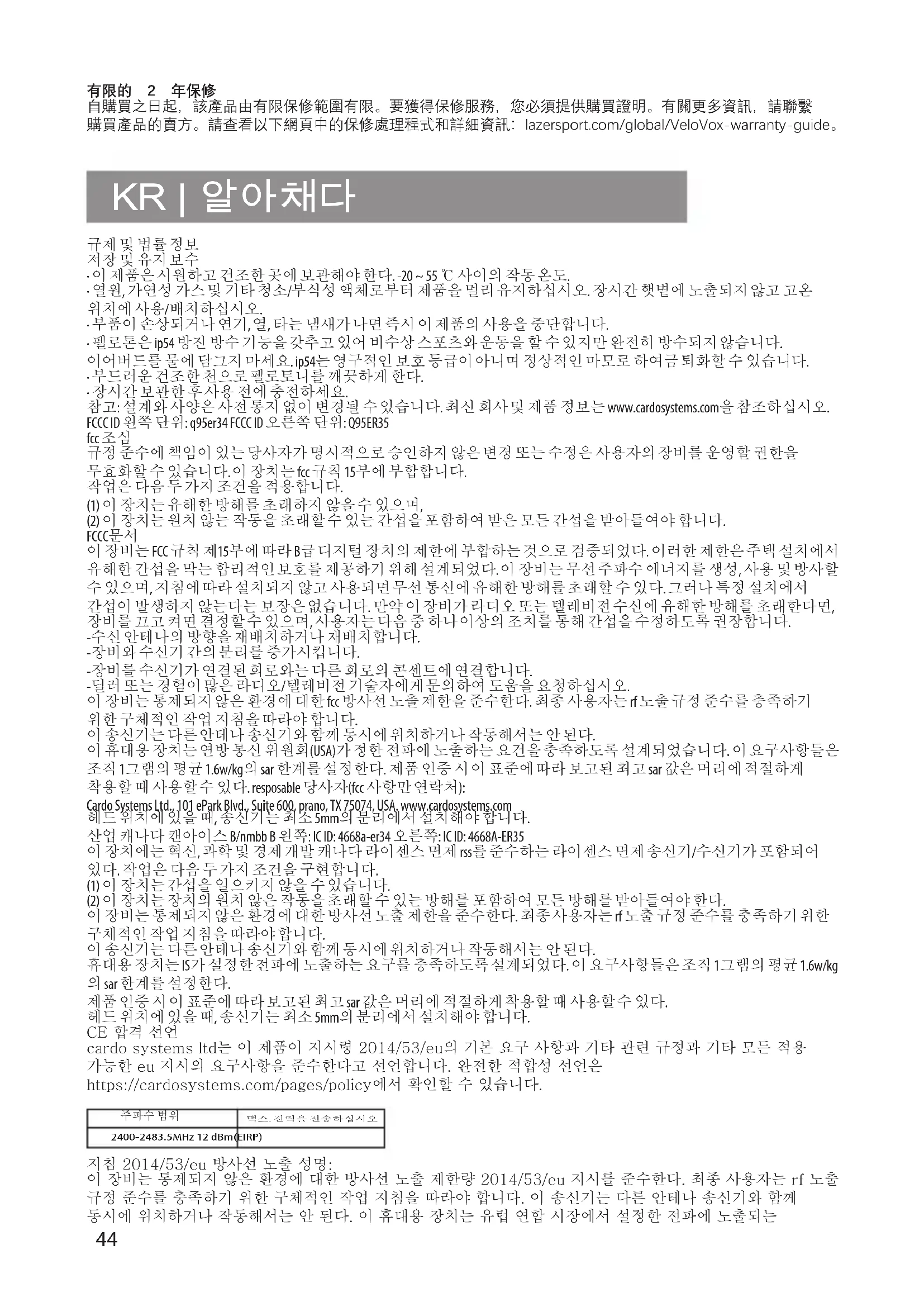 - 장시간 보관한 후 사용 전에 충전하세요. 참고: 설계와 사양은 사전 통지 없이 변경될 수 있습니다. 최신 회사 및 제품 정보는 www.cardosystems.com을 참조하십시오. FCCC ID 왼쪽 단위: q95er34 FCCC ID 오른쪽 단위: Q95ER35 fcc 조심 규정 준수에 책임이 있는 당사자가 명시적으로 승인하지 않은 변경 또는 수정은 사용자의 장비를 운영할 권한을 무효화할 수 있습니다. 이 장치는 fcc 규칙 15부에 부합합니다. 작업은 다음 두 가지 조건을 적용합니다. (1) 이 장치는 유해한 방해를 초래하지 않을 수 있으며, (2) 이 장치는 원치 않는 작동을 초래할 수 있는 간섭을 포함하여 받은 모든 간섭을 받아들여야 합니다. FCCC문서 이 장비는 FCC 규칙 제15부에 따라 B급 디지털 장치의 제한에 부합하는 것으로 검증되었다. 이러한 제한은 주택 설치에서 유해한 간섭을 막는 합리적인 보호를 제공하기 위해 설계되었다. 이 장비는 무선 주파수 에너지를 생성, 사용 및 방사할 수 있으며, 지침에 따라 설치되지 않고 사용되면 무선 통신에 유해한 방해를 초래할 수 있다. 그러나 특정 설치에서 간섭이 발생하지 않는다는 보장은 없습니다. 만약 이 장비가 라디오 또는 텔레비전 수신에 유해한 방해를 초래한다면, 장비를 끄고 켜면 결정할 수 있으며, 사용자는 다음 중 하나 이상의 조치를 통해 간섭을 수정하도록 권장합니다. -수신 안테나의 방향을 재배치하거나 재배치합니다. -장비와 수신기 간의 분리를 증가시킵니다. -장비를 수신기가 연결된 회로와는 다른 회로의 콘센트에 연결합니다. -딜러 또는 경험이 많은 라디오/텔레비전 기술자에게 문의하여 도움을 요청하십시오. 이 장비는 통제되지 않은 환경에 대한 fcc 방사선 노출 제한을 준수한다. 최종 사용자는 rf 노출 규정 준수를 충족하기 위한 구체적인 작업 지침을 따라야 합니다. 이 송신기는 다른 안테나 송신기와 함께 동시에 위치하거나 작동해서는 안 된다. 이 휴대용 장치는 연방 통신 위원회(USA)가 정한 전파에 노출하는 요건을 충족하도록 설계되었습니다. 이 요구사항들은 조직 1그램의 평균 1.6w/kg의 sar 한계를 설정한다. 제품 인증 시 이 표준에 따라 보고된 최고 sar 값은 머리에 적절하게 착용할 때 사용할 수 있다. resposable 당사자(fcc 사항만 연락처): Cardo Systems Ltd., 101 ePark Blvd., Suite 600, prano, TX 75074, USA. www.cardosystems.com 헤드 위치에 있을 때, 송신기는 최소 5mm의 분리에서 설치해야 합니다. 산업 캐나다 캔아이스 B/nmbb B 왼쪽: IC ID: 4668a-er34 오른쪽: IC ID: 4668A-ER35 이 장치에는 혁신, 과학 및 경제 개발 캐나다 라이센스 면제 rss를 준수하는 라이센스 면제 송신기/수신기가 포함되어 있다. 작업은 다음 두 가지 조건을 구현합니다. (1) 이 장치는 간섭을 일으키지 않을 수 있습니다. (2) 이 장치는 장치의 원치 않은 작동을 초래할 수 있는 방해를 포함하여 모든 방해를 받아들여야 한다. 이 장비는 통제되지 않은 환경에 대한 방사선 노출 제한을 준수한다. 최종 사용자는 rf 노출 규정 준수를 충족하기 위한 구체적인 작업 지침을 따라야 합니다. 이 송신기는 다른 안테나 송신기와 함께 동시에 위치하거나 작동해서는 안 된다. 휴대용 장치는 IS가 설정한 전파에 노출하는 요구를 충족하도록 설계되었다. 이 요구사항들은 조직 1그램의 평균 1.6w/kg 의 sar 한계를 설정한다. 제품 인증 시 이 표준에 따라 보고된 최고 sar 값은 머리에 적절하게 착용할 때 사용할 수 있다. 헤드 위치에 있을 때, 송신기는 최소 5mm의 분리에서 설치해야 합니다. CE 합격 선언 cardo systems ltd는 이 제품이 지시령 2014/53/eu의 기본 요구 사항과 기타 관련 규정과 기타 모든 적용 가능한 eu 지시의 요구사항을 준수한다고 선언합니다. 완전한 적합성 선언은 https://cardosystems.com/pages/policy에서 확인할 수 있습니다. 지침 2014/53/eu 방사선 노출 성명: 이 장비는 통제되지 않은 환경에 대한 방사선 노출 제한량 2014/53/eu 지시를 준수한다. 최종 사용자는 rf 노출 규정 준수를 충족하기 위한 구체적인 작업 지침을 따라야 합니다. 이 송신기는 다른 안테나 송신기와 함께 동시에 위치하거나 작동해서는 안 된다. 이 휴대용 장치는 유럽 연합 시장에서 설정한 전파에 노출되는 KR | 알아채다 有限的 2 年保修 自購買之日起,該產品由有限保修範圍有限。要獲得保修服務,您必須提供購買證明。有關更多資訊,請聯繫 購買產品的賣方。請查看以下網頁中的保修處理程式和詳細資訊:lazersport.com/global/VeloVox-warranty-guide。 44요구사항을 충족하도록 설계되었다. 이 요구사항들은 조직의 평균 10그램을 초과하는 2w/kg의 sar한계 를 설정한다. 제품 인증 시 이 표준에 따라 보고된 최고 sar 값 0.453w/kg 10-g는 머리에 적절하게 착용할 때