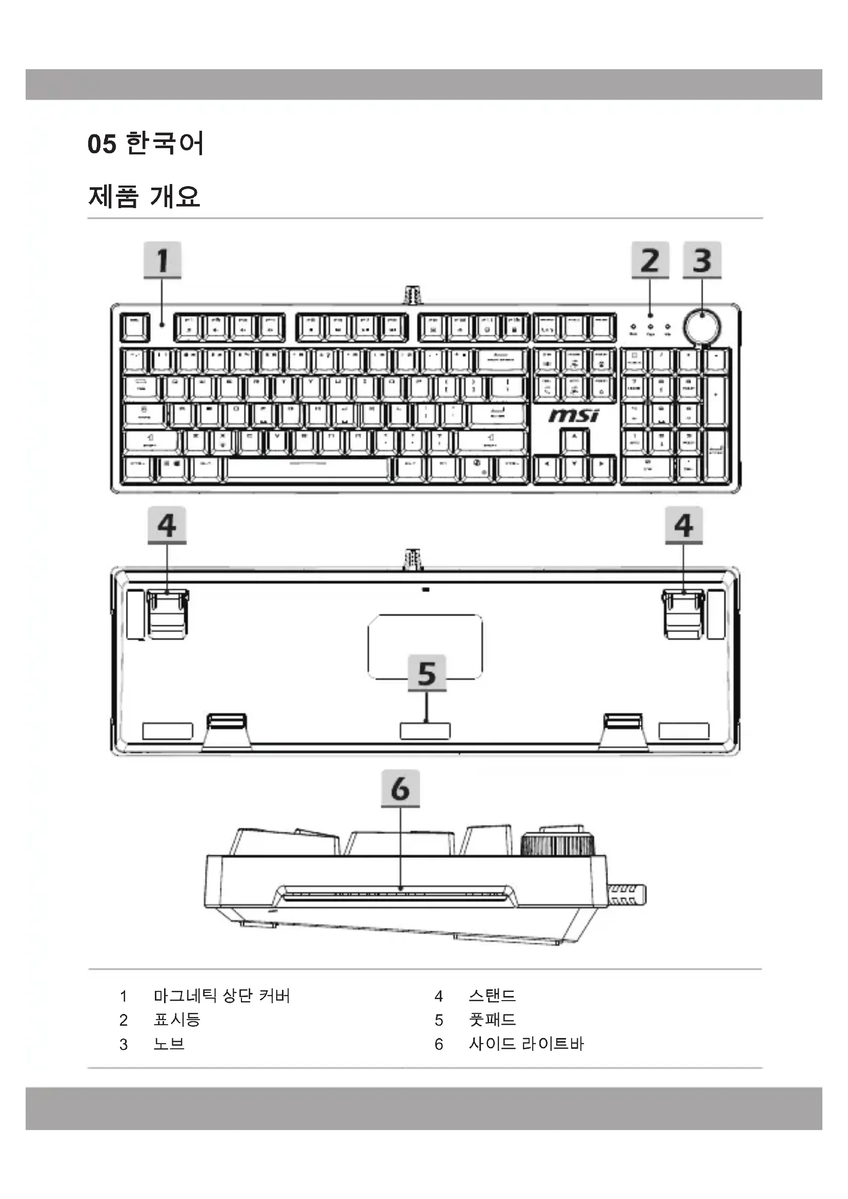 1 마그네틱 상단 커버 2 표시등 3 노브 4 스탠드 5 풋패드 6 사이드 라이트바24 5가지 내장 게임 조명 효과 그룹 조명 효과를 나타내는 검은색 점은 참고용일 뿐입니다. 1 게임 모드 1 (FN + 1), 불 켜기 : W, A, S, D,↑ ,↓ , ←, → 2 게임 모드 2 (FN + 2), 불 켜기 : ESC, 1, 2, 3, 4, 5, TAB, Q, W, E, R, A, S, D, F, G, SHIFT-L, CTRL-L, Space24 25 3 게임 모드 3 (FN + 3), 불 켜기 : ESC, ~, 1, 2, 3, 4, 5, TAB, Q, W, E, P, A, S, D, F, G, V, B, CTRL-L, Space 4 게임 모드 4 (FN + 4) (기본값으로), 불 켜기 : W, A, S, D,↑ ,↓ , ←, → 5 게임 모드 5 (FN + 5) (기본값으로), 불 켜기 : W, A, S, D,↑ ,↓ , ←, →26