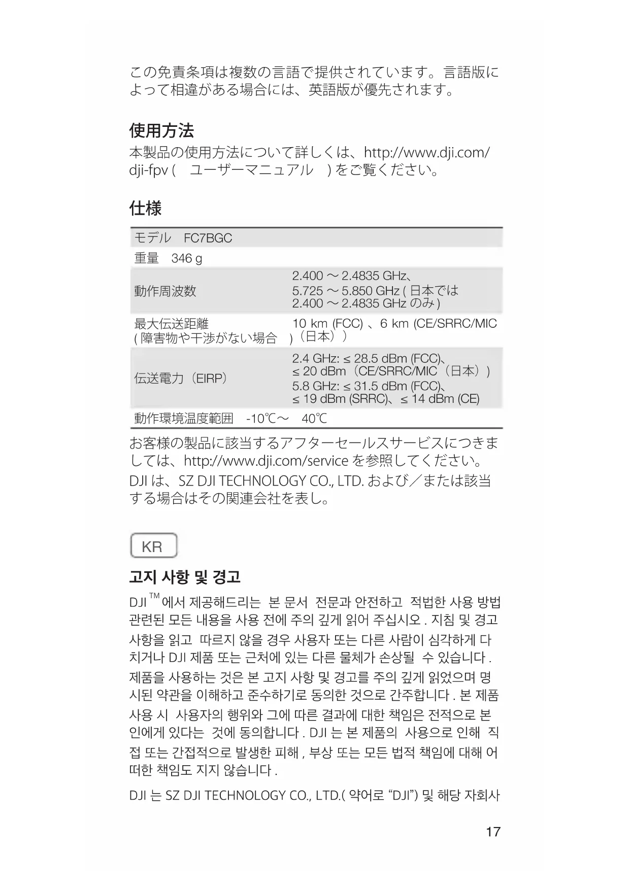 에서 제공해드리는 본 문서 전문과 안전하고 적법한 사용 방법 관련된 모든 내용을 사용 전에 주의 깊게 읽어 주십시오 . 지침 및 경고 사항을 읽고 따르지 않을 경우 사용자 또는 다른 사람이 심각하게 다 치거나 DJI 제품 또는 근처에 있는 다른 물체가 손상될 수 있습니다 . 제품을 사용하는 것은 본 고지 사항 및 경고를 주의 깊게 읽었으며 명 시된 약관을 이해하고 준수하기로 동의한 것으로 간주합니다 . 본 제품 사용 시 사용자의 행위와 그에 따른 결과에 대한 책임은 전적으로 본 인에게 있다는 것에 동의합니다 . DJI 는 본 제품의 사용으로 인해 직 접 또는 간접적으로 발생한 피해 , 부상 또는 모든 법적 책임에 대해 어 떠한 책임도 지지 않습니다 . DJI 는 SZ DJI TECHNOLOGY CO., LTD.( 약어로 “DJI”) 및 해당 자회사18 의 상표입니다 . 본 문서에 표시된 제품명 , 브랜드 등은 해당 소유 회사 의 상표 또는 등록 상표입니다 . DJI 는 본 제품 및 문서의 저작권과 함 께 모든 권리를 보유합니다 . 본 제품 또는 문서의 어떠한 부분도 DJI 의 서면 허가 또는 동의 없이 어떠한 형식으로 재생산할 수 없습니다 . 이 문서 및 기타 모든 부수적인 문서는 DJI 의 단독 재량에 따라 변경 될 수 있습니다 . 최신 제품 정보를 확인하려면 http://www.dji.com 을 방문하여 본 제품에 대한 제품 페이지를 클릭하십시오 . 이 고지 사항은 다양한 언어로 제공됩니다 . 각 언어 버전 간에 차이가 있을 경우 , 영어 버전이 우선합니다 .
