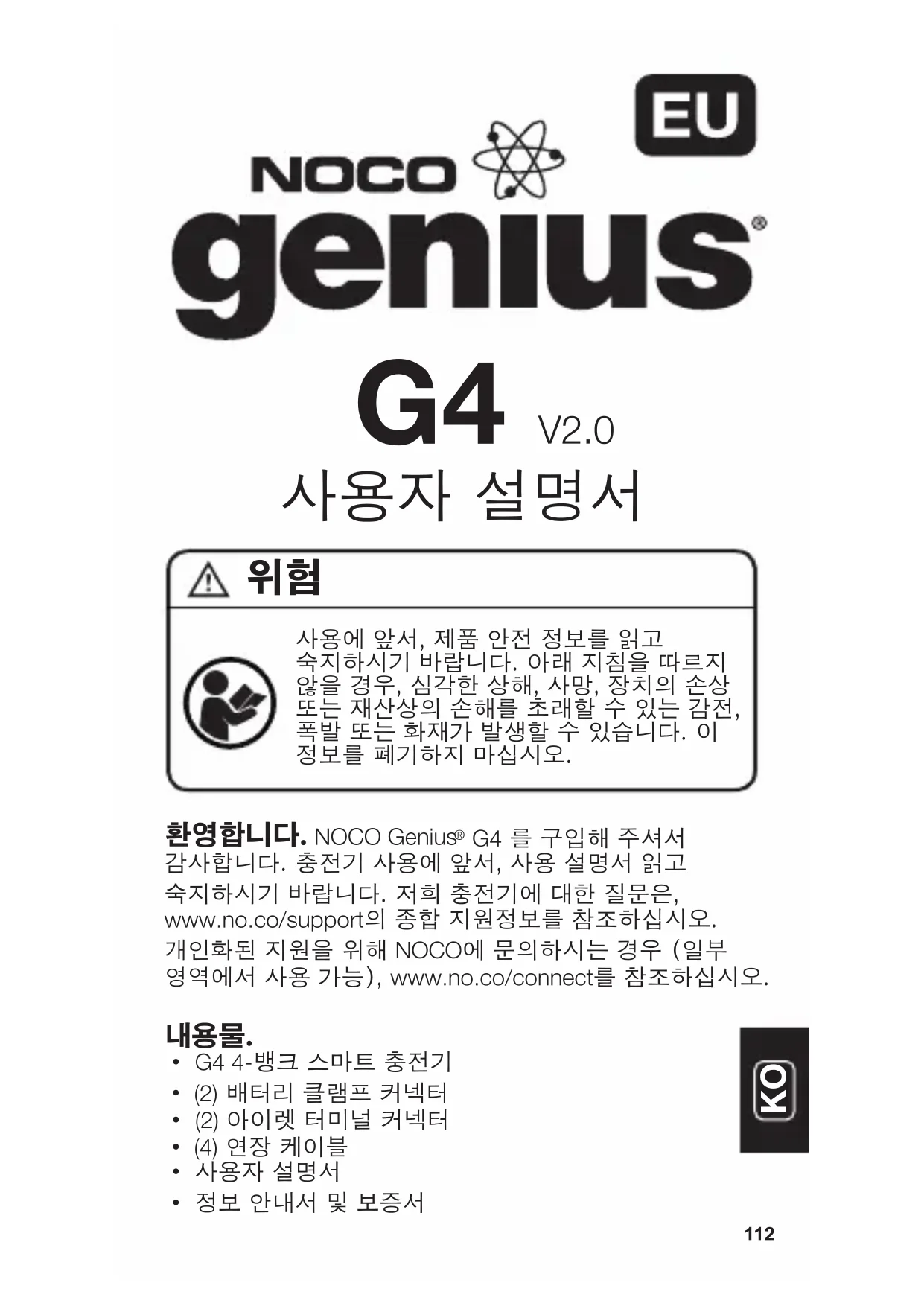 G4 를 구입해 주셔서 감사합니다. 충전기 사용에 앞서, 사용 설명서 읽고 숙지하시기 바랍니다. 저희 충전기에 대한 질문은, www.no.co/support의 종합 지원정보를 참조하십시오. 개인화된 지원을 위해 NOCO에 문의하시는 경우 (일부 영역에서 사용 가능), www.no.co/connect를 참조하십시오.
