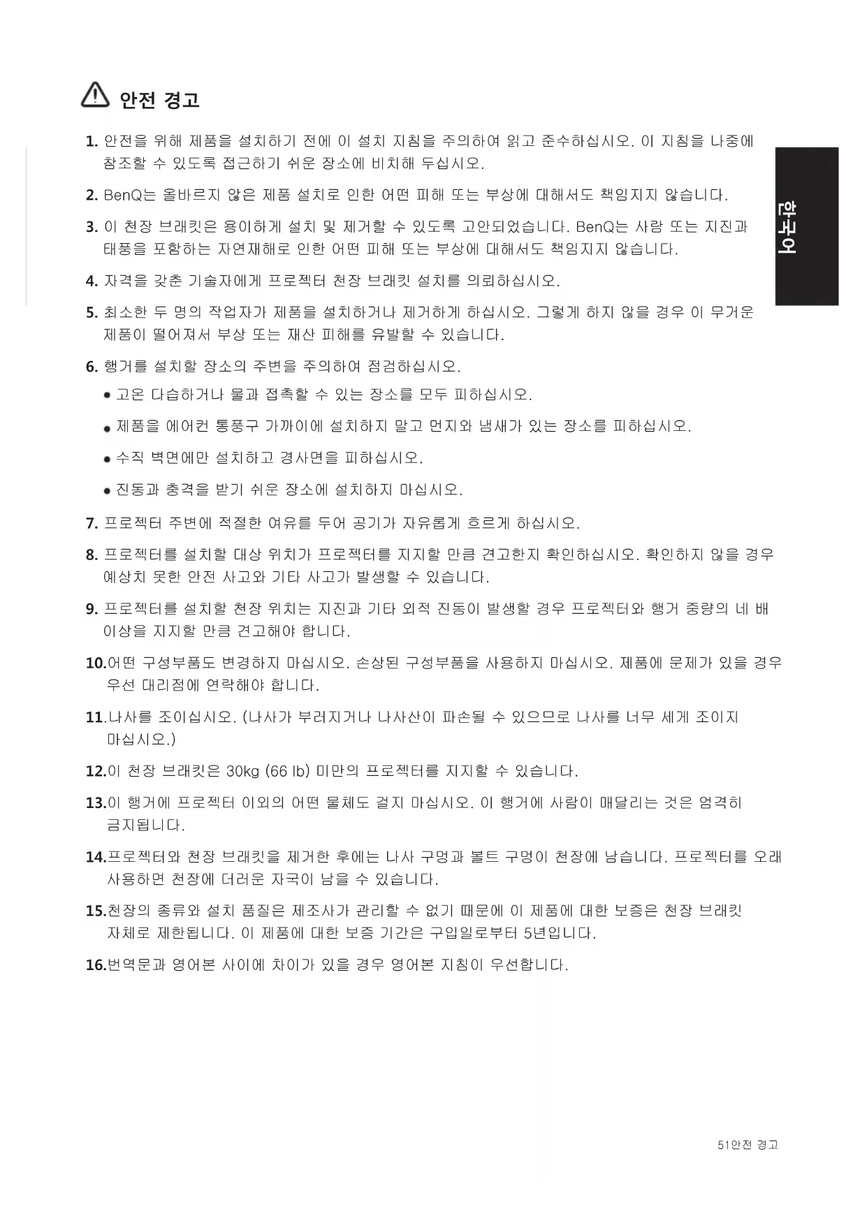 2. BenQ는 올바르지 않은 제품 설치로 인한 어떤 피해 또는 부상에 대해서도 책임지지 않습니다.