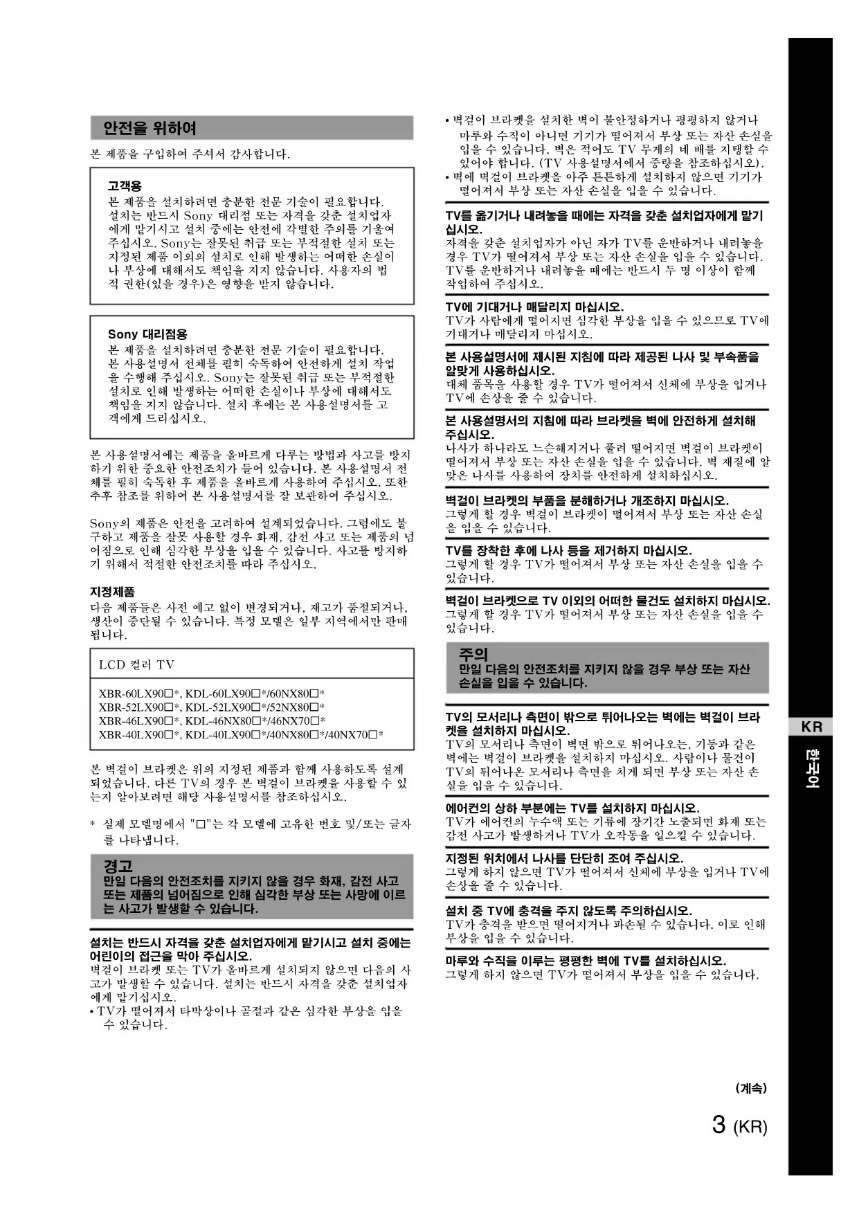본 제품을 설치하려면 충분한 전문 기술이 필요합니다. 설치는 반드시 Sony 대리점 또는 자격을 갖춘 설치업자 에게 맡기시고 설치 중에는 안전에 각별한 주의를 기울여 주십시오. Sony는 잘못된 취급 또는 부적절한 설치 또는 지정된 제품 이외의 설치로 인해 발생하는 어떠한 손실이 나 부상에 대해서도 책임을 지지 않습니다. 사용자의 법 적 권한(있을 경우)은 영향을 받지 않습니다. Sony 대리점용 본 제품을 설치하려면 충분한 전문 기술이 필요합니다. 본 사용설명서 전체를 필히 숙독하여 안전하게 설치 작업 을 수행해 주십시오. Sony는 잘못된 취급 또는 부적절한 설치로 인해 발생하는 어떠한 손실이나 부상에 대해서도 책임을 지지 않습니다. 설치 후에는 본 사용설명서를 고