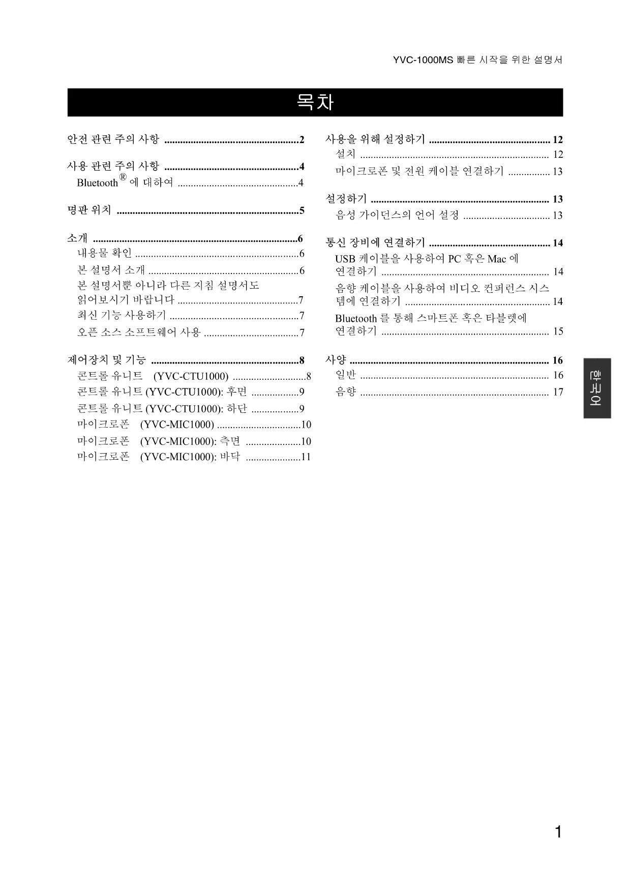 Yamaha YVC-1000MS 을 구입해 주셔서 감사합니다 . YVC-1000MS 은 PC 혹은 Mac, 스마트폰 혹은 타블렛 , 비디오 컨퍼런스 시스템 등의 통신 장비에 연결하여 음향 단자로 사용할 수 있는 통합 커뮤니케이션 마이크로폰 및 스피커 제품을 설치 및 연결하기 전에 본 설명서를 자세히 읽어보시기 바랍니다 . 추후에도 참조할 수 있도록 본 설명서를 안전한 장소에 보관하십시오 .