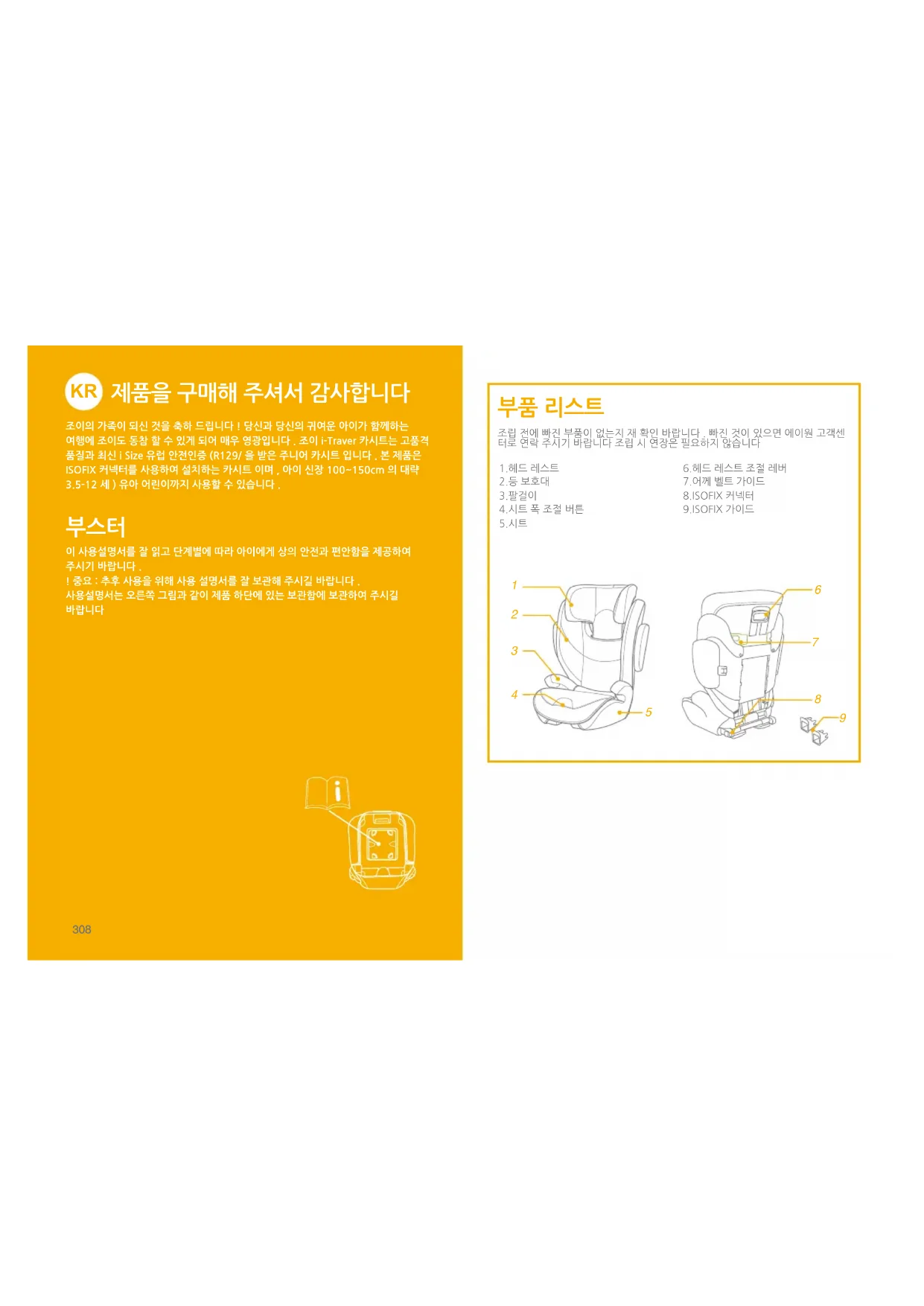 제품을 구매해 주셔서 감사합니다 조이의 가족이 되신 것을 축하 드립니다 ! 당신과 당신의 귀여운 아이가 함께하는 여행에 조이도 동참 할 수 있게 되어 매우 영광입니다 . 조이 i-Traver 카시트는 고품격 품질과 최신 i Size 유럽 안전인증 (R129/ 을 받은 주니어 카시트 입니다 . 본 제품은 ISOFIX 커넥터를 사용하여 설치하는 카시트 이며 , 아이 신장 100~150cm 의 대략 3.5-12 세 ) 유아 어린이까지 사용할 수 있습니다 . 이 사용설명서를 잘 읽고 단계별에 따라 아이에게 상의 안전과 편안함을 제공하여 주시기 바랍니다 .! 중요 : 추후 사용을 위해 사용 설명서를 잘 보관해 주시길 바랍니다 .사용설명서는 오른쪽 그림과 같이 제품 하단에 있는 보관함에 보관하여 주시길