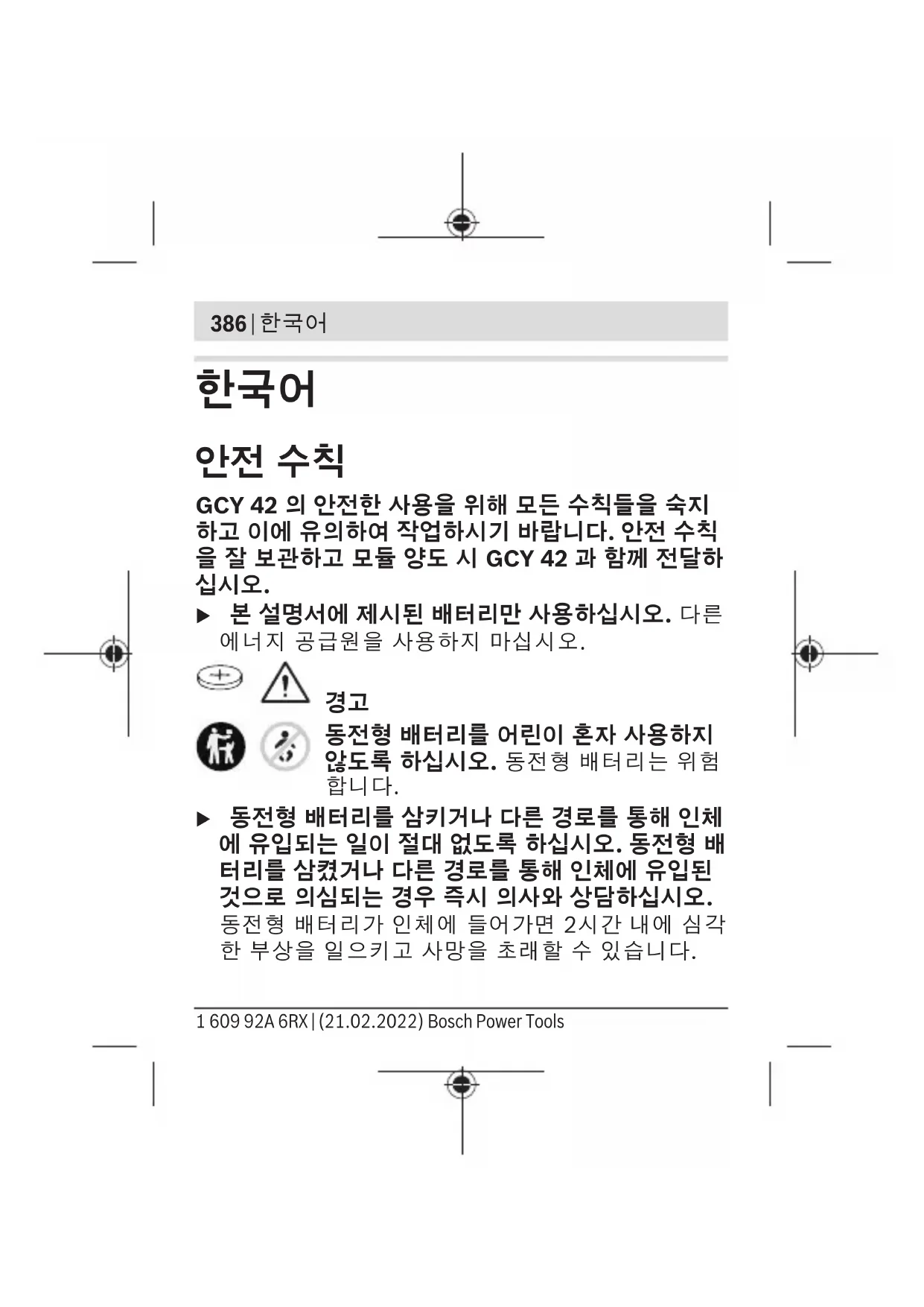 u 동전형 배터리를 삼키거나 다른 경로를 통해 인체 에 유입되는 일이 절대 없도록 하십시오. 동전형 배 터리를 삼켰거나 다른 경로를 통해 인체에 유입된 것으로 의심되는 경우 즉시 의사와 상담하십시오. 동전형 배터리가 인체에 들어가면 2시간 내에 심각 한 부상을 일으키고 사망을 초래할 수 있습니다. 1 609 92A 6RX | (21.02.2022) Bosch Power Tools한국어 | 387 u 동전형 배터리 교환 시 올바른 방법으로 동전형 배 터리를 교환하십시오. 폭발 위험이 있습니다. u 본 설명서에 제시된 동전형 배터리만 사용하십시 오. 다른 동전형 배터리 또는 다른 에너지 공급원을