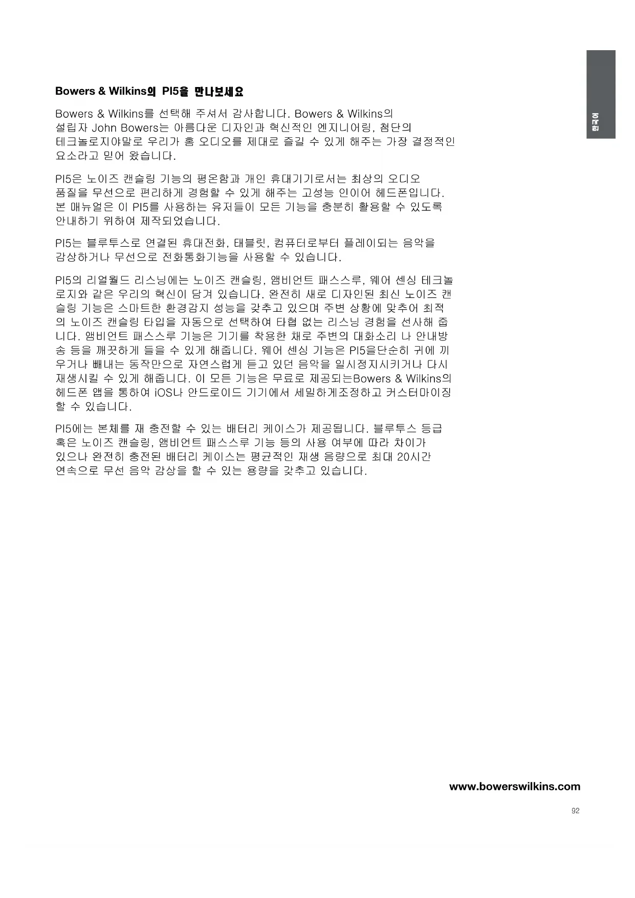 www.bowerswilkins.com Bowers & Wilkins의 PI5을 만나보세요 Bowers & Wilkins를 선택해 주셔서 감사합니다. Bowers & Wilkins의 설립자 John Bowers는 아름다운 디자인과 혁신적인 엔지니어링, 첨단의 테크놀로지야말로 우리가 홈 오디오를 제대로 즐길 수 있게 해주는 가장 결정적인 요소라고 믿어 왔습니다. PI5은 노이즈 캔슬링 기능의 평온함과 개인 휴대기기로서는 최상의 오디오 품질을 무선으로 편리하게 경험할 수 있게 해주는 고성능 인이어 헤드폰입니다. 본 매뉴얼은 이 PI5를 사용하는 유저들이 모든 기능을 충분히 활용할 수 있도록 안내하기 위하여 제작되었습니다. PI5는 블루투스로 연결된 휴대전화, 태블릿, 컴퓨터로부터 플레이되는 음악을 감상하거나 무선으로 전화통화기능을 사용할 수 있습니다. PI5의 리얼월드 리스닝에는 노이즈 캔슬링, 앰비언트 패스스루, 웨어 센싱 테크놀 로지와 같은 우리의 혁신이 담겨 있습니다. 완전히 새로 디자인된 최신 노이즈 캔 슬링 기능은 스마트한 환경감지 성능을 갖추고 있으며 주변 상황에 맞추어 최적 의 노이즈 캔슬링 타입을 자동으로 선택하여 타협 없는 리스닝 경험을 선사해 줍 니다. 앰비언트 패스스루 기능은 기기를 착용한 채로 주변의 대화소리 나 안내방 송 등을 깨끗하게 들을 수 있게 해줍니다. 웨어 센싱 기능은 PI5을단순히 귀에 끼 우거나 빼내는 동작만으로 자연스럽게 듣고 있던 음악을 일시정지시키거나 다시 재생시킬 수 있게 해줍니다. 이 모든 기능은 무료로 제공되는Bowers & Wilkins의 헤드폰 앱을 통하여 iOS나 안드로이드 기기에서 세밀하게조정하고 커스터마이징