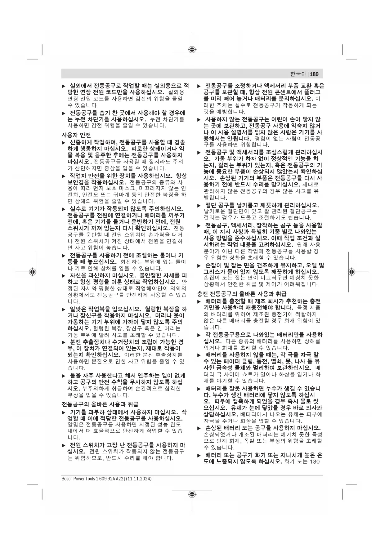 u 배터리 또는 공구가 화기 또는 지나치게 높은 온 도에 노출되지 않도록 하십시오. 화기 또는 130 Bosch Power Tools 1 609 92A A22 | (11.11.2024)190 | 한국어 °C 이상의 온도에 노출되면 폭발할 위험이 있습
