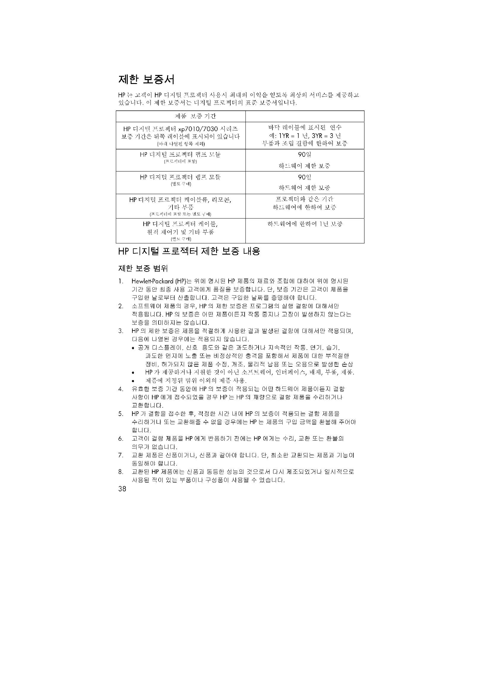 HP 는 고객이 HP 디지털 프로젝터 사용시 최대의 이익을 얻도록 최상의 서비스를 제공하고 있습니다. 이 제한 보증서는 디지털 프로젝터의 표준 보증서입니다.