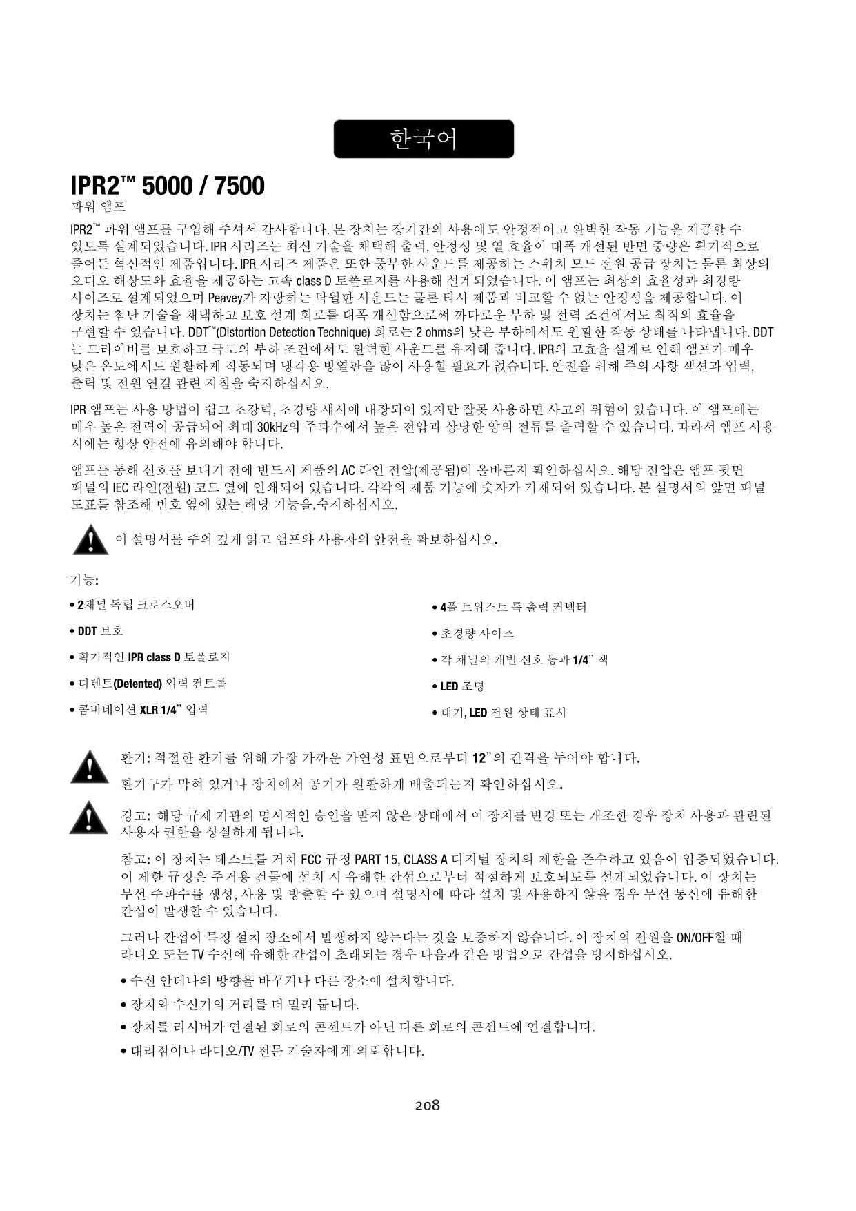 파워 앰프를 구입해 주셔서 감사합니다. 본 장치는 장기간의 사용에도 안정적이고 완벽한 작동 기능을 제공할 수 있도록 설계되었습니다. IPR 시리즈는 최신 기술을 채택해 출력, 안정성 및 열 효율이 대폭 개선된 반면 중량은 획기적으로 줄어든 혁신적인 제품입니다. IPR 시리즈 제품은 또한 풍부한 사운드를 제공하는 스위치 모드 전원 공급 장치는 물론 최상의 오디오 해상도와 효율을 제공하는 고속 class D 토폴로지를 사용해 설계되었습니다. 이 앰프는 최상의 효율성과 최경량 사이즈로 설계되었으며 Peavey가 자랑하는 탁월한 사운드는 물론 타사 제품과 비교할 수 없는 안정성을 제공합니다. 이 장치는 첨단 기술을 채택하고 보호 설계 회로를 대폭 개선함으로써 까다로운 부하 및 전력 조건에서도 최적의 효율을 구현할 수 있습니다. DDT