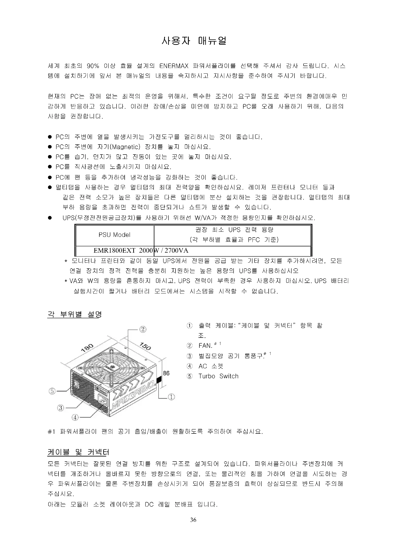 세계 최초의 90% 이상 효율 설계의 ENERMAX 파워서플라이를 선택해 주셔서 감사 드립니다. 시스 템에 설치하기에 앞서 본 매뉴얼의 내용을 숙지하시고 지시사항을 준수하여 주시기 바랍니다. 현재의 PC는 장애 없는 최적의 운영을 위해서, 특수한 조건이 요구될 정도로 주변의 환경에매우 민 감하게 반응하고 있습니다. 이러한 장애/손상을 미연에 방지하고 PC를 오래 사용하기 위해, 다음의