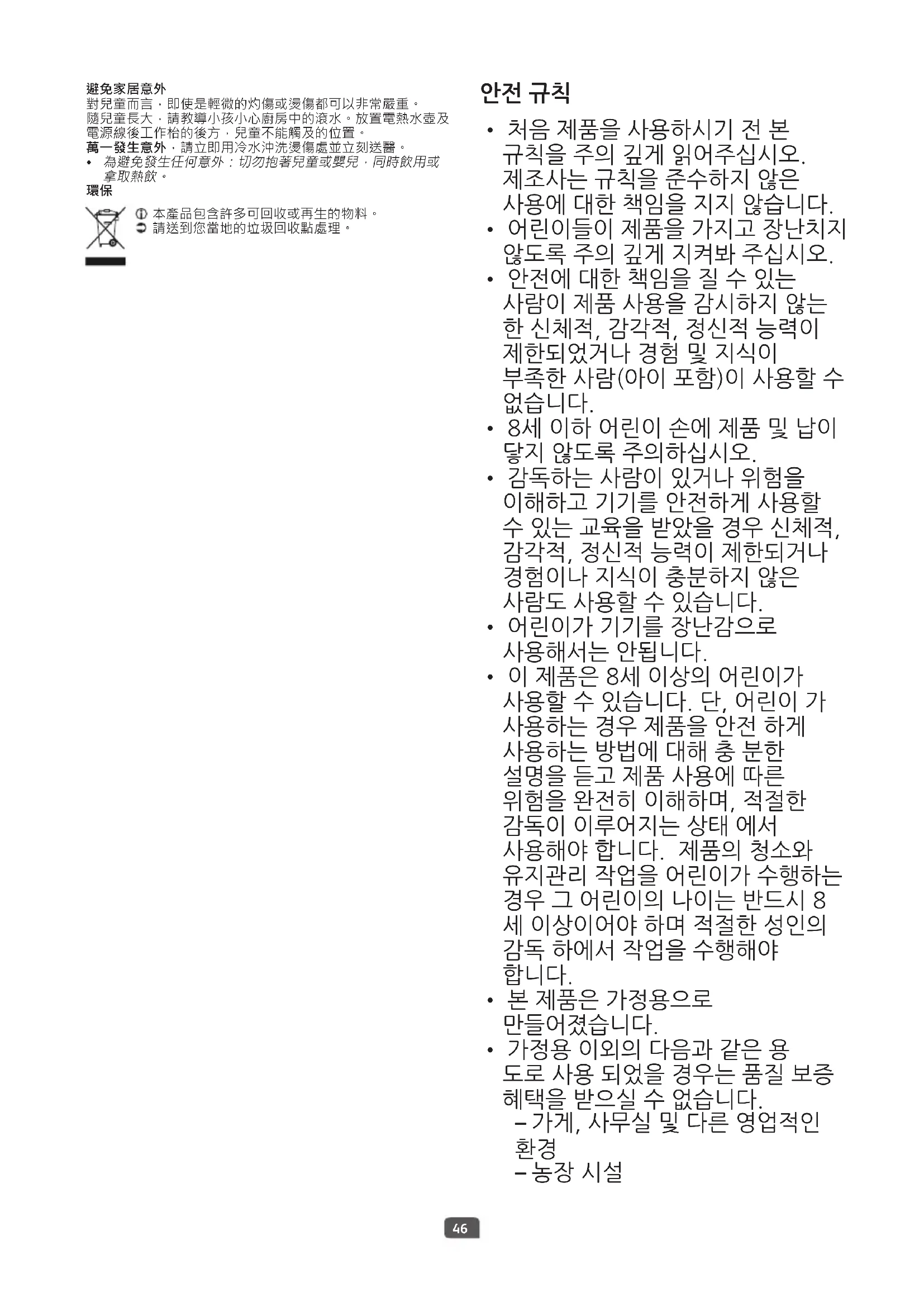 - 감독하는 사람이 있거나 위험을 이해하고 기기를 안전하게 사용할 수 있는 교육을 받았을 경우 신체적, 감각적, 정신적 능력이 제한되거나 경험이나 지식이 충분하지 않은 사람도 사용할 수 있습니다.