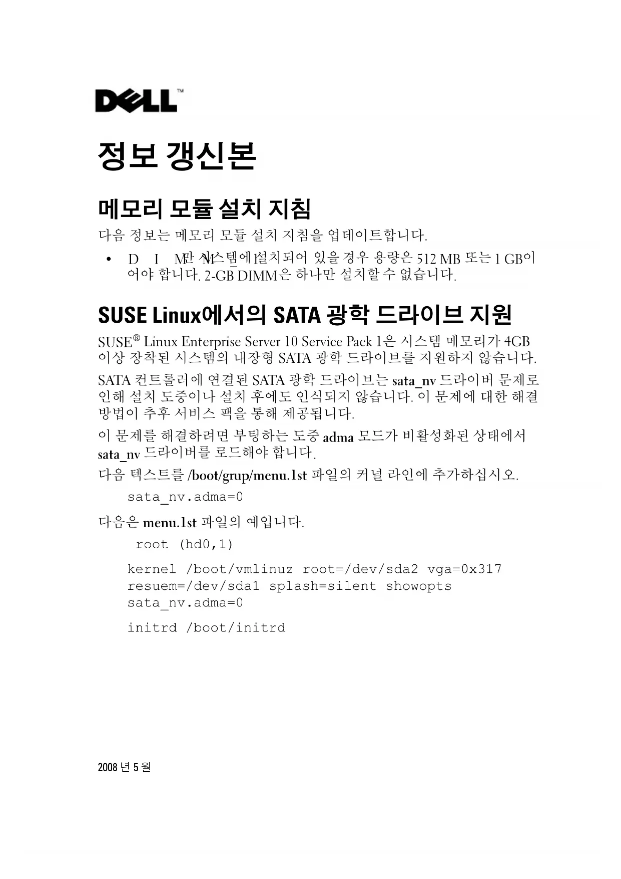 Linux Enterprise Server 10 Service Pack 1은 시스템 메모리가 4GB 이상 장착된 시스템의 내장형 SATA 광학 드라이브를 지원하지 않습니다. SATA 컨트롤러에 연결된 SATA 광학 드라이브는 sata_nv 드라이버 문제로 인해 설치 도중이나 설치 후에도 인식되지 않습니다. 이 문제에 대한 해결 방법이 추후 서비스 팩을 통해 제공됩니다. 이 문제를 해결하려면 부팅하는 도중 adma