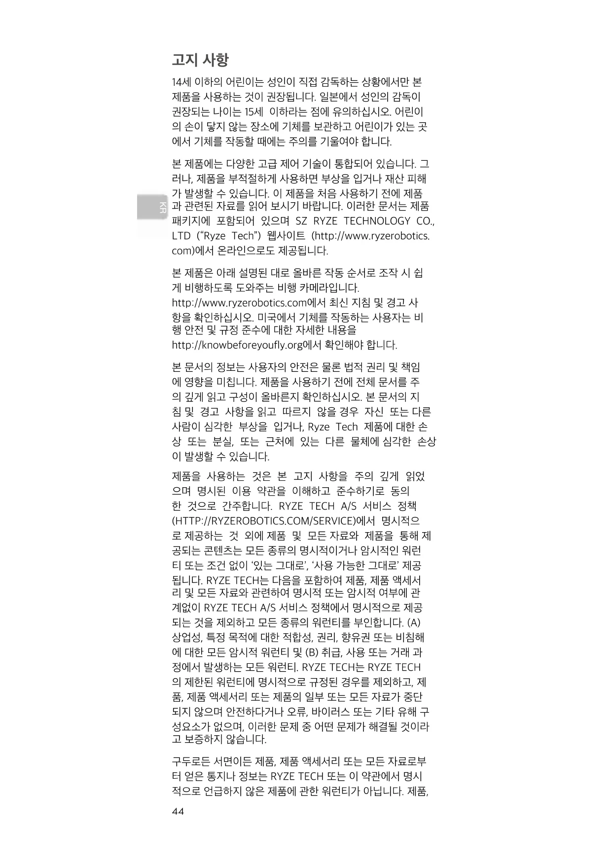 14세 이하의 어린이는 성인이 직접 감독하는 상황에서만 본 제품을 사용하는 것이 권장됩니다. 일본에서 성인의 감독이 권장되는 나이는 15세 이하라는 점에 유의하십시오. 어린이 의 손이 닿지 않는 장소에 기체를 보관하고 어린이가 있는 곳 에서 기체를 작동할 때에는 주의를 기울여야 합니다. 본 제품에는 다양한 고급 제어 기술이 통합되어 있습니다. 그 러나, 제품을 부적절하게 사용하면 부상을 입거나 재산 피해 가 발생할 수 있습니다. 이 제품을 처음 사용하기 전에 제품 과 관련된 자료를 읽어 보시기 바랍니다. 이러한 문서는 제품 패키지에 포함되어 있으며 SZ RYZE TECHNOLOGY CO., LTD (“Ryze Tech”) 웹사이트 (http://www.ryzerobotics. com)에서 온라인으로도 제공됩니다. 본 제품은 아래 설명된 대로 올바른 작동 순서로 조작 시 쉽 게 비행하도록 도와주는 비행 카메라입니다. http://www.ryzerobotics.com에서 최신 지침 및 경고 사 항을 확인하십시오. 미국에서 기체를 작동하는 사용자는 비 행 안전 및 규정 준수에 대한 자세한 내용을 http://knowbeforeyoufly.org에서 확인해야 합니다. 본 문서의 정보는 사용자의 안전은 물론 법적 권리 및 책임 에 영향을 미칩니다. 제품을 사용하기 전에 전체 문서를 주 의 깊게 읽고 구성이 올바른지 확인하십시오. 본 문서의 지 침 및 경고 사항을 읽고 따르지 않을 경우 자신 또는 다른 사람이 심각한 부상을 입거나, Ryze Tech 제품에 대한 손 상 또는 분실, 또는 근처에 있는 다른 물체에 심각한 손상 이 발생할 수 있습니다. 제품을 사용하는 것은 본 고지 사항을 주의 깊게 읽었 으며 명시된 이용 약관을 이해하고 준수하기로 동의