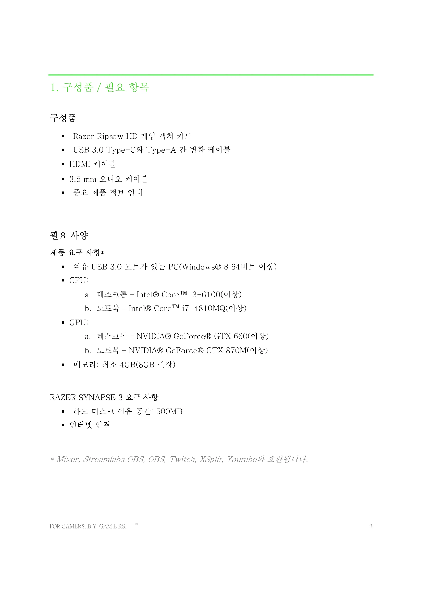 XSplit과 XSplit Broadcaster는 Splitmedialabs Limited.의 등록 상표입니다. Razer Inc.(“Razer”)는 이 안내서에서 언급된 제품과 관련하여 (등록 여부와 관계없이) 저작권, 상표, 영업 비밀, 특허, 특허 신청 또는 기타 지적 재산권을 보유하고 있을 수 있습니다. 이 안내서를 제공한다고 해서 그러한 저작권, 상표, 특허 또는 기타 지적 재산권에 대한 라이선스를 제공하는 것은 아닙니다. Razer Ripsaw HD(이하 "제품")는 패키지나 그 외의 경우에 실린 사진과 다를 수 있습니다. Razer는 나타날 수 있는 이러한 차이 또는 오류에 대해 어떠한 책임도 지지 않습니다. 여기에 포함된 정보는 사전 고지 없이 변경될 수