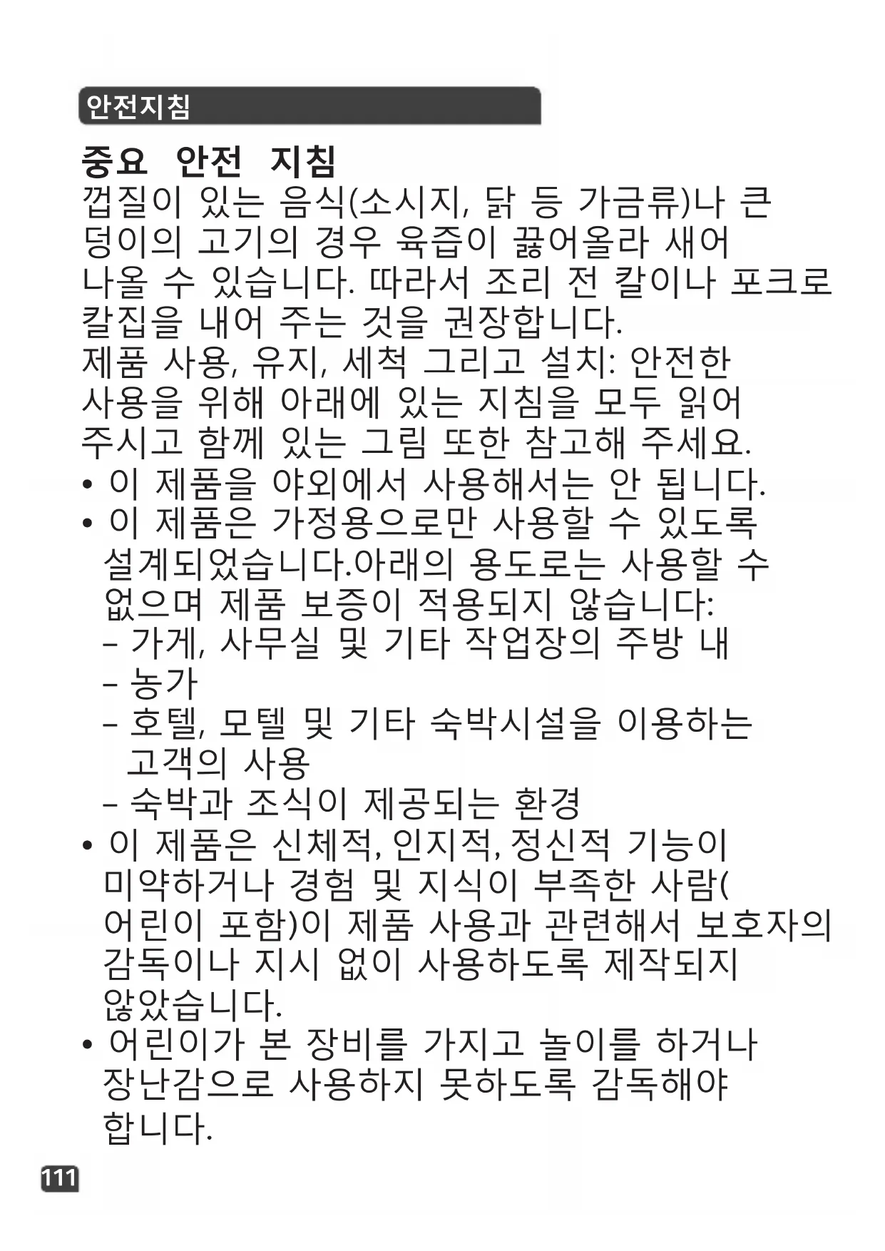 - 이 제품은 신체적, 인지적, 정신적 기능이 미약하거나 경험 및 지식이 부족한 사람( 어린이 포함)이 제품 사용과 관련해서 보호자의 감독이나 지시 없이 사용하도록 제작되지