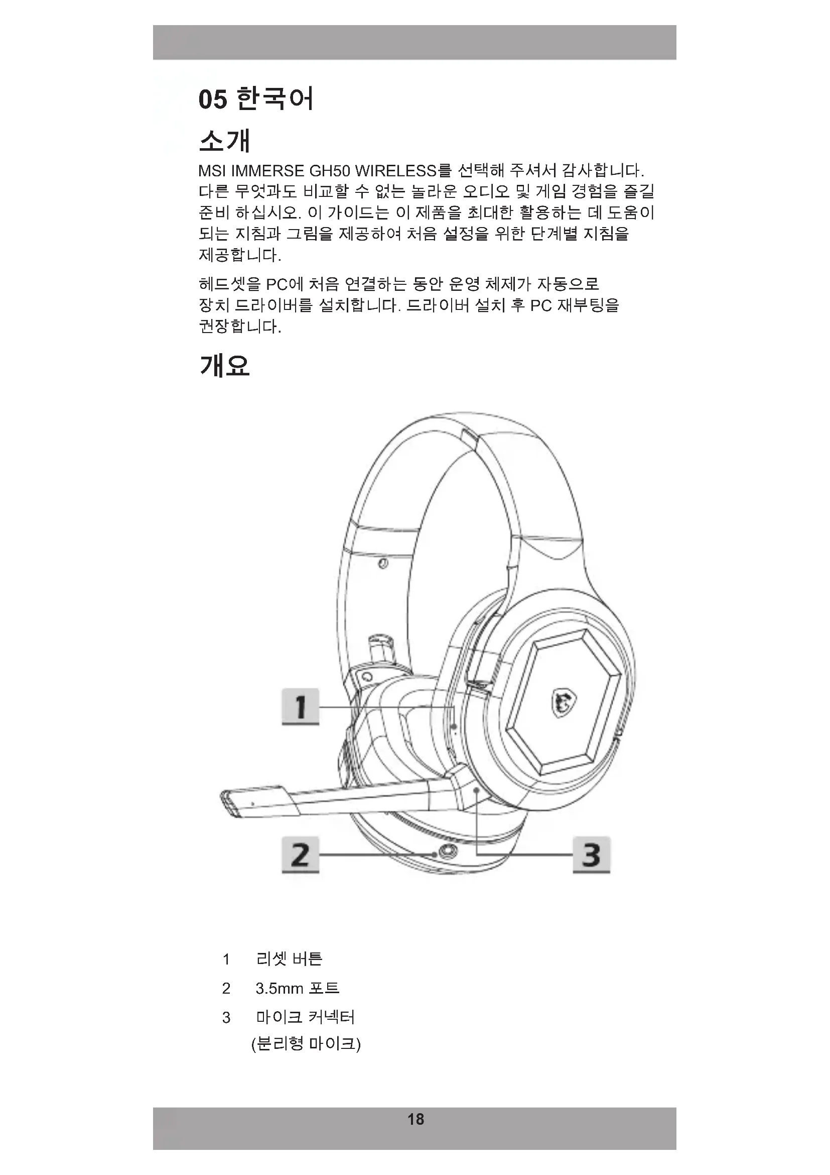MSI IMMERSE GH50 WIRELESS를 선택해 주셔서 감사합니다. 다른 무엇과도 비교할 수 없는 놀라운 오디오 및 게임 경험을 즐길 준비 하십시오. 이 가이드는 이 제품을 최대한 활용하는 데 도움이 되는 지침과 그림을 제공하여 처음 설정을 위한 단계별 지침을