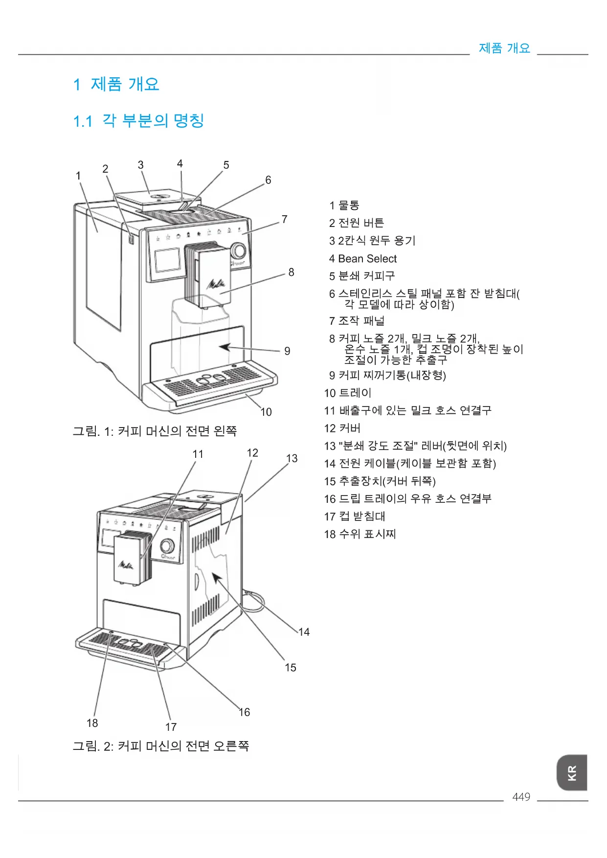 그림. 2: 커피 머신의 전면 오른쪽 1 물통 2 전원 버튼 3 2칸식 원두 용기 4 Bean Select 5 분쇄 커피구 6 스테인리스 스틸 패널 포함 잔 받침대( 각 모델에 따라 상이함) 7 조작 패널 8 커피 노즐 2개, 밀크 노즐 2개, 온수 노즐 1개, 컵 조명이 장착된 높이 조절이 가능한 추출구 9 커피 찌꺼기통(내장형) 10 트레이 11 배출구에 있는 밀크 호스 연결구 12 커버 13 "분쇄 강도 조절" 레버(뒷면에 위치) 14 전원 케이블(케이블 보관함 포함) 15 추출장치(커버 뒤쪽) 16 드립 트레이의 우유 호스 연결부 17 컵 받침대 18 수위 표시찌제품 개요