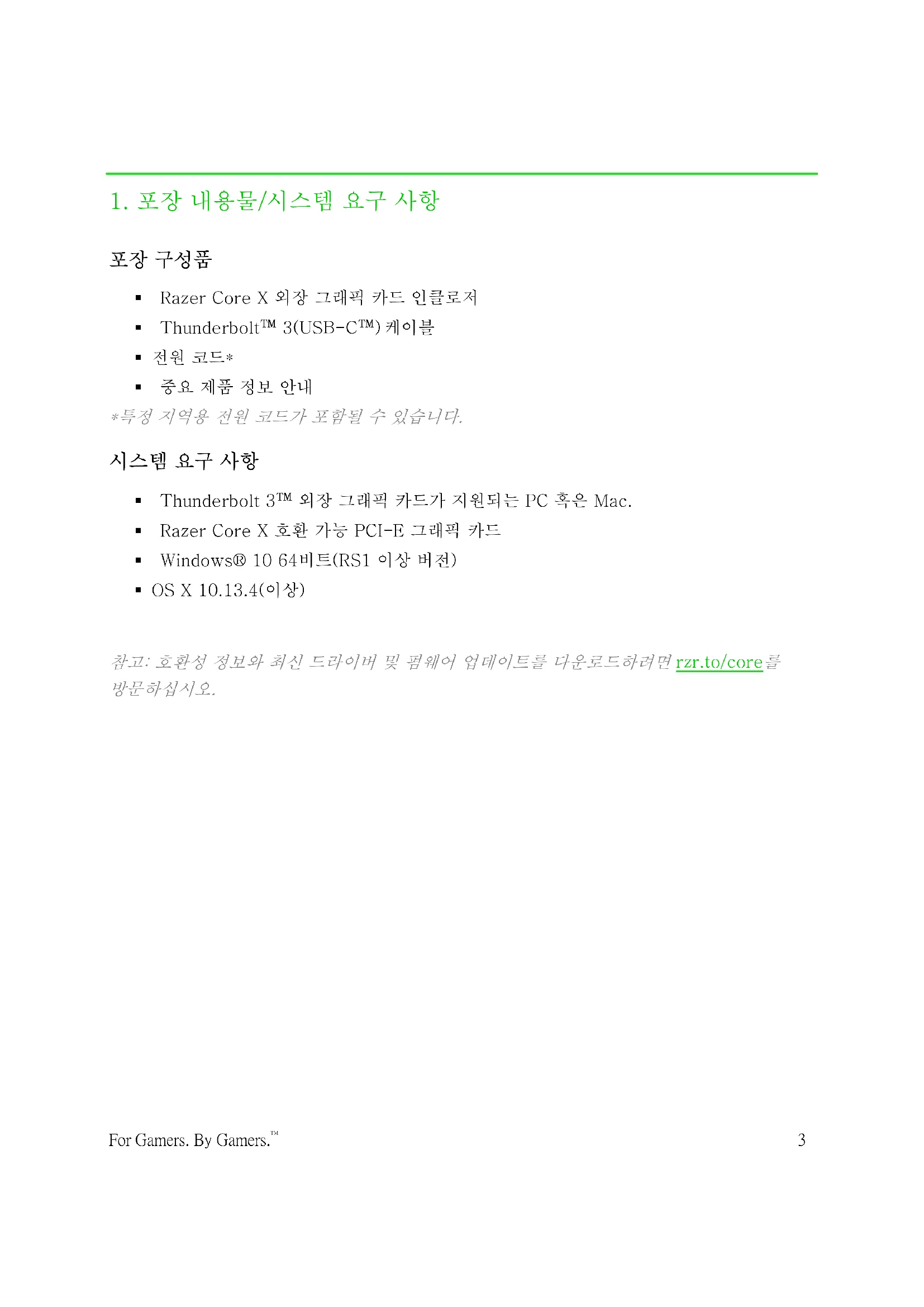 시스템 업데이트가 필요할 수 있음 Razer Core X가 제대로 작동하려면 호환 가능한 Razer Blade Stealth 또는 Razer Blade에는 소프트웨어 업데이트가 필요할 수 있습니다. 다음 웹 사이트에서 최신 소프트웨어가 시스템에 설치되어 있는지 확인하십시오. rzr.to/core-update