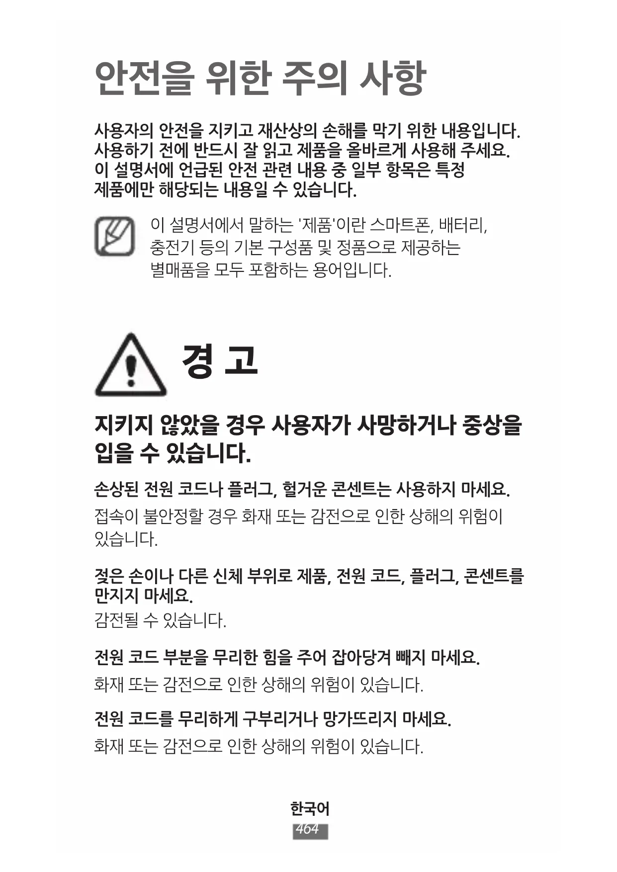 안전을 위한 주의 사항 사용자의 안전을 지키고 재산상의 손해를 막기 위한 내용입니다. 사용하기 전에 반드시 잘 읽고 제품을 올바르게 사용해 주세요. 이 설명서에 언급된 안전 관련 내용 중 일부 항목은 특정 제품에만 해당되는 내용일 수 있습니다. 이 설명서에서 말하는 '제품'이란 스마트폰, 배터리, 충전기 등의 기본 구성품 및 정품으로 제공하는 별매품을 모두 포함하는 용어입니다.