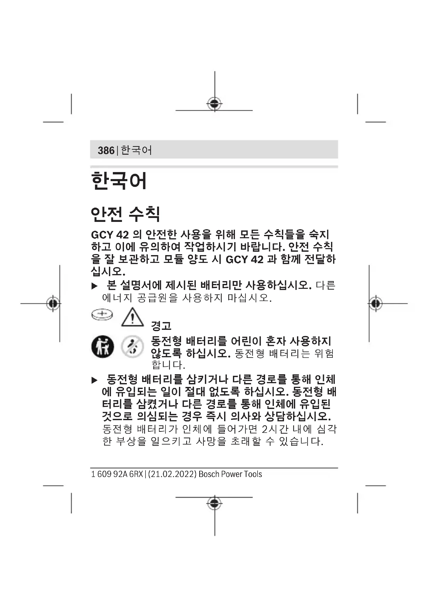 u 동전형 배터리를 삼키거나 다른 경로를 통해 인체 에 유입되는 일이 절대 없도록 하십시오. 동전형 배 터리를 삼켰거나 다른 경로를 통해 인체에 유입된 것으로 의심되는 경우 즉시 의사와 상담하십시오. 동전형 배터리가 인체에 들어가면 2시간 내에 심각 한 부상을 일으키고 사망을 초래할 수 있습니다. 1 609 92A 6RX | (21.02.2022) Bosch Power Tools한국어 | 387 u 동전형 배터리 교환 시 올바른 방법으로 동전형 배 터리를 교환하십시오. 폭발 위험이 있습니다. u 본 설명서에 제시된 동전형 배터리만 사용하십시 오. 다른 동전형 배터리 또는 다른 에너지 공급원을