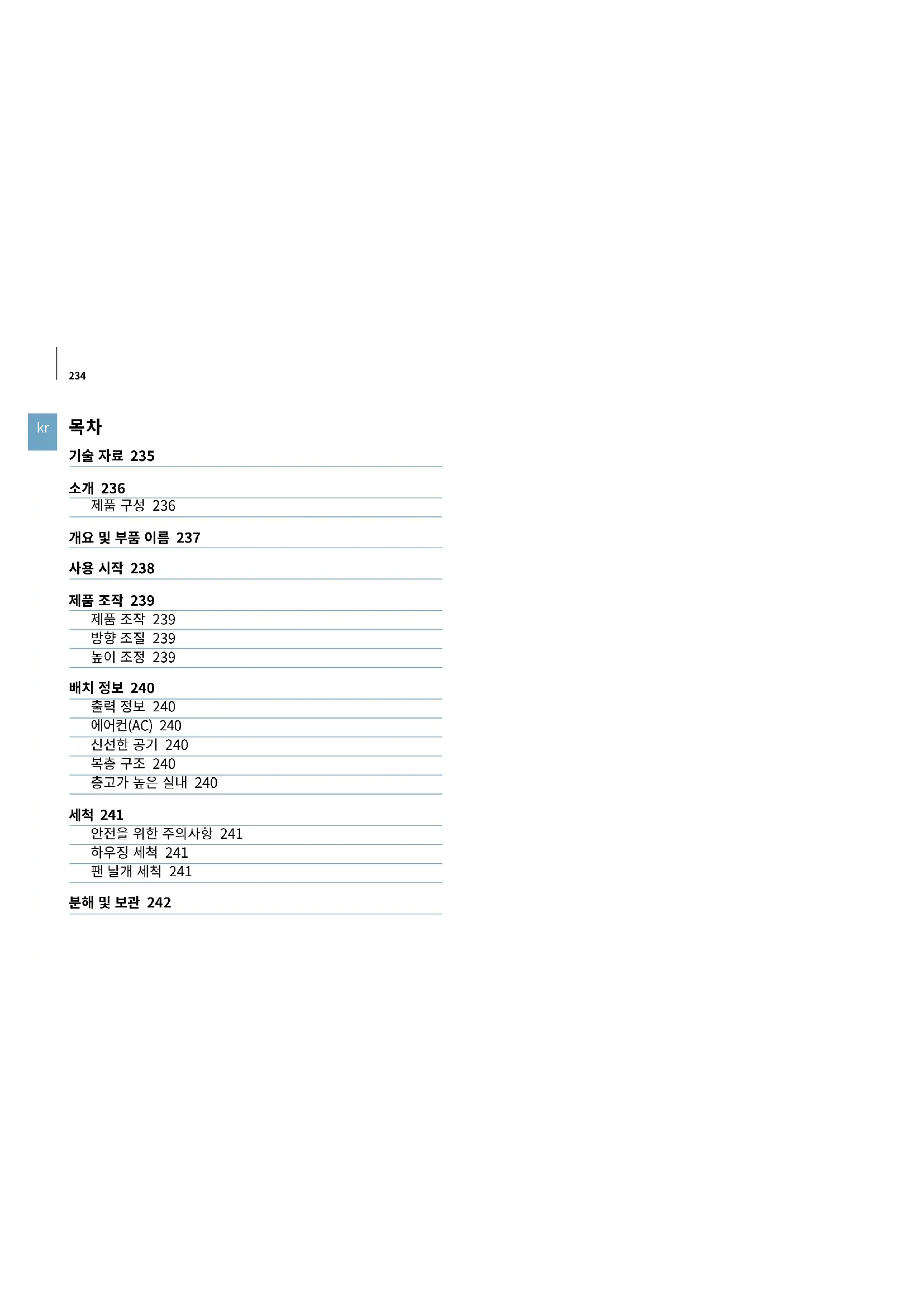 안전을 위한 주의사항 241 하우징 세척 241 팬 날개 세척 241 235