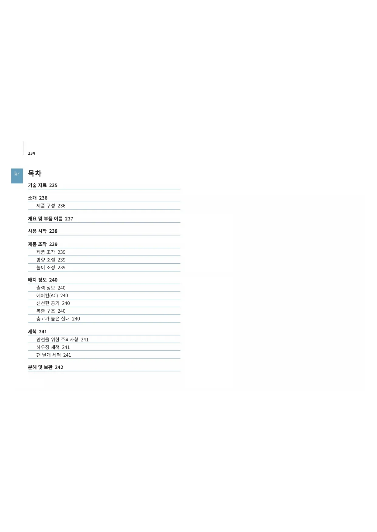 안전을 위한 주의사항 241 하우징 세척 241 팬 날개 세척 241 235