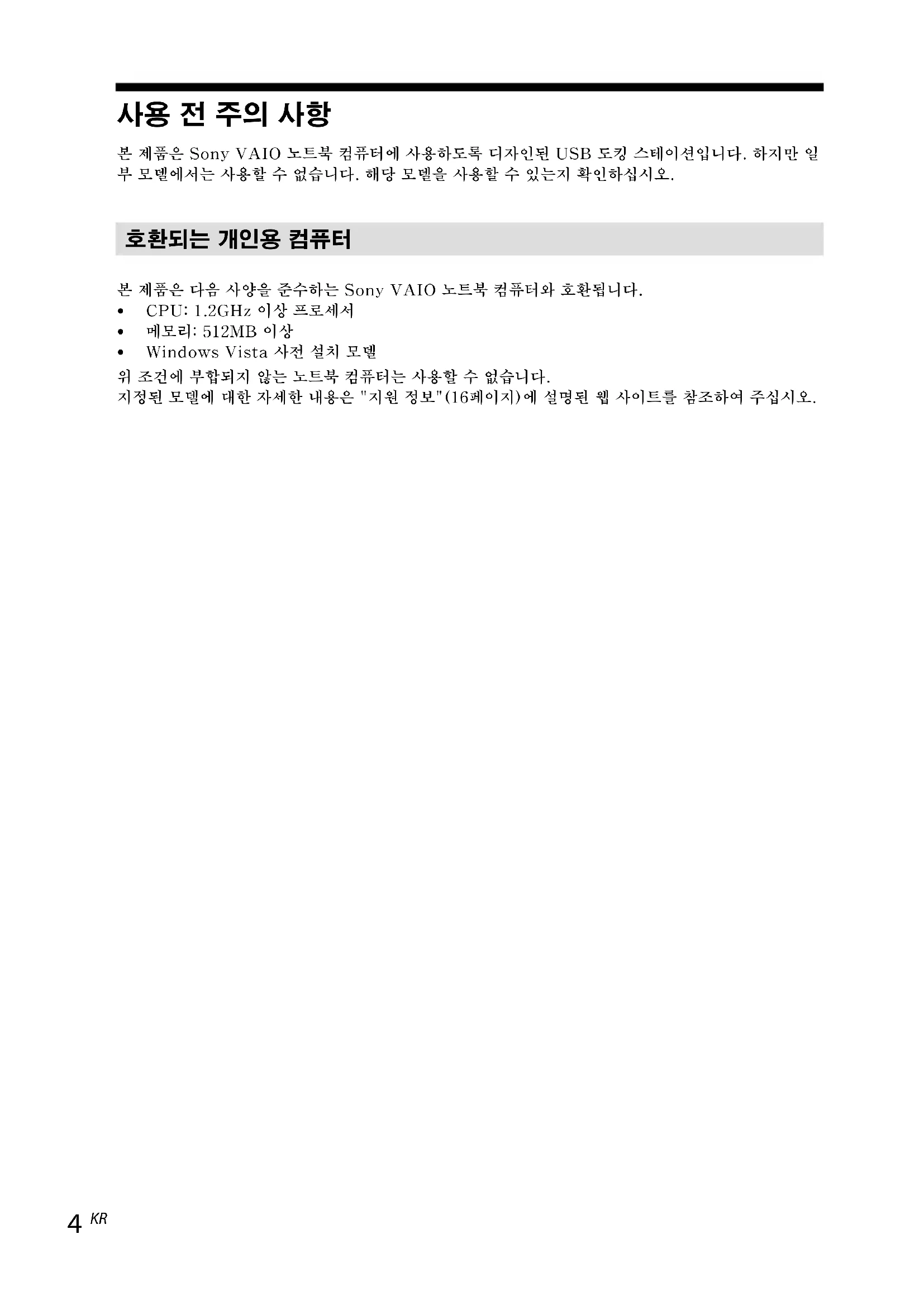 본제품은SonyVAIO노트북컴퓨터에사용하도록디자인된USB도킹스테이션입니다.하지만일부모델에서는사용할수없습니다.해당모델을사용할수있는지확인하십시오. 호환되는 개인용 컴퓨터 본제품은다음사양을준수하는SonyVAIO노트북컴퓨터와호환됩니다. CPU:1.2GHz이상프로세서 메모리:512MB이상 WindowsVista사전설치모델위조건에부합되지않는노트북컴퓨터는사용할수없습니다.지정된모델에대한자세한내용은"지원정보"(16페이지)에설명된웹사이트를참조하여주십시오.VGP-UPR1 (JP/GB/FR/ES/CT/KR) 3-296-348-02(1)