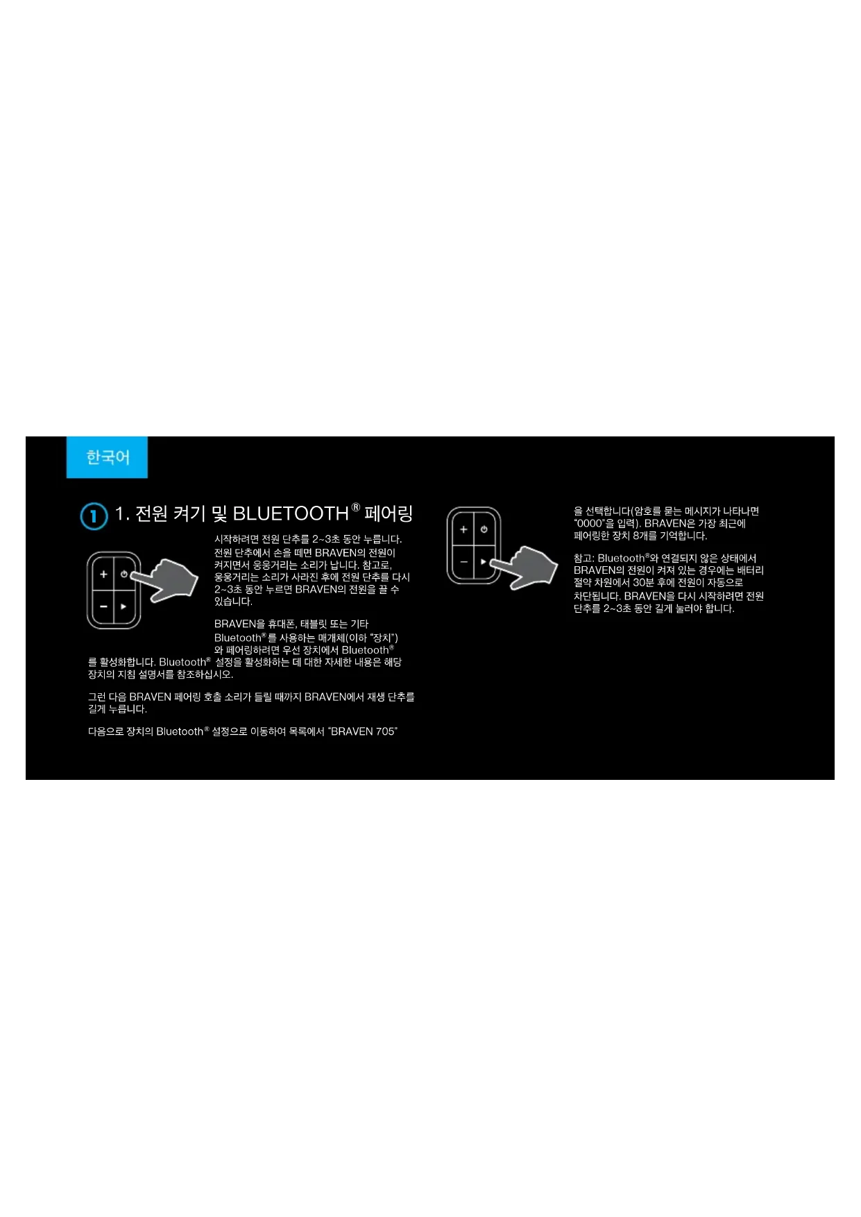 와 연결되지 않은 상태에서 BRAVEN의 전원이 켜져 있는 경우에는 배터리 절약 차원에서 30분 후에 전원이 자동으로 차단됩니다. BRAVEN을 다시 시작하려면 전원 단추를 2~3초 동안 길게 눌러야 합니다. 1장치 2개를 함께 페어링 – 무선 스테레오