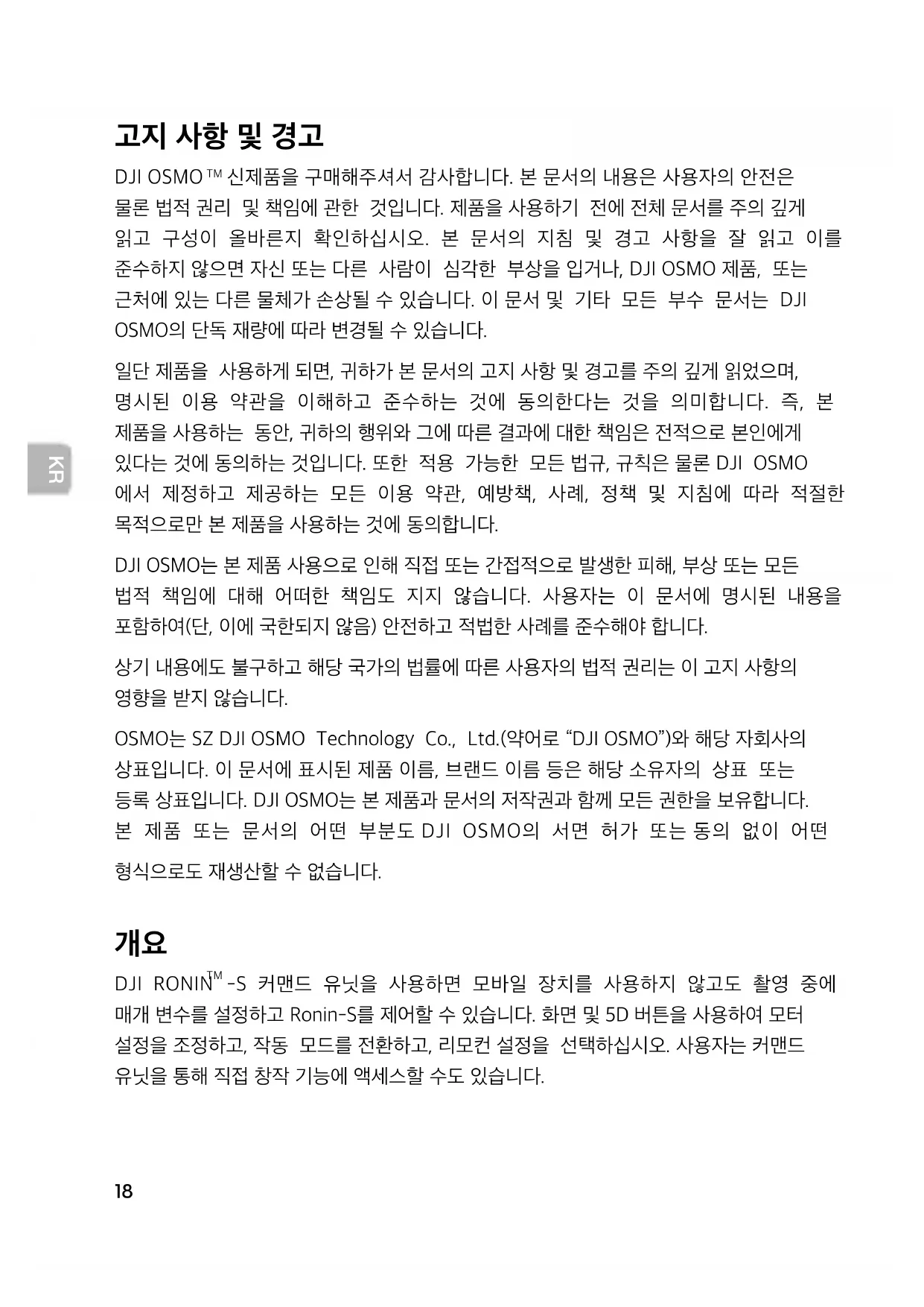 신제품을 구매해주셔서 감사합니다. 본 문서의 내용은 사용자의 안전은 물론 법적 권리 및 책임에 관한 것입니다. 제품을 사용하기 전에 전체 문서를 주의 깊게 읽고 구성이 올바른지 확인하십시오. 본 문서의 지침 및 경고 사항을 잘 읽고 이를 준수하지 않으면 자신 또는 다른 사람이 심각한 부상을 입거나, DJI OSMO 제품, 또는 근처에 있는 다른 물체가 손상될 수 있습니다. 이 문서 및 기타 모든 부수 문서는 DJI OSMO의 단독 재량에 따라 변경될 수 있습니다. 일단 제품을 사용하게 되면, 귀하가 본 문서의 고지 사항 및 경고를 주의 깊게 읽었으며, 명시된 이용 약관을 이해하고 준수하는 것에 동의한다는 것을 의미합니다. 즉, 본 제품을 사용하는 동안, 귀하의 행위와 그에 따른 결과에 대한 책임은 전적으로 본인에게 있다는 것에 동의하는 것입니다. 또한 적용 가능한 모든 법규, 규칙은 물론 DJI OSMO 에서 제정하고 제공하는 모든 이용 약관, 예방책, 사례, 정책 및 지침에 따라 적절한 목적으로만 본 제품을 사용하는 것에 동의합니다. DJI OSMO는 본 제품 사용으로 인해 직접 또는 간접적으로 발생한 피해, 부상 또는 모든 법적 책임에 대해 어떠한 책임도 지지 않습니다. 사용자는 이 문서에 명시된 내용을 포함하여(단, 이에 국한되지 않음) 안전하고 적법한 사례를 준수해야 합니다. 상기 내용에도 불구하고 해당 국가의 법률에 따른 사용자의 법적 권리는 이 고지 사항의 영향을 받지 않습니다. OSMO는 SZ DJI OSMO Technology Co., Ltd.(약어로 “DJI OSMO”)와 해당 자회사의 상표입니다. 이 문서에 표시된 제품 이름, 브랜드 이름 등은 해당 소유자의 상표 또는 등록 상표입니다. DJI OSMO는 본 제품과 문서의 저작권과 함께 모든 권한을 보유합니다. 본 제품 또는 문서의 어떤 부분도 DJI OSMO의 서면 허가 또는 동의 없이 어떤 형식으로도 재생산할 수 없습니다.