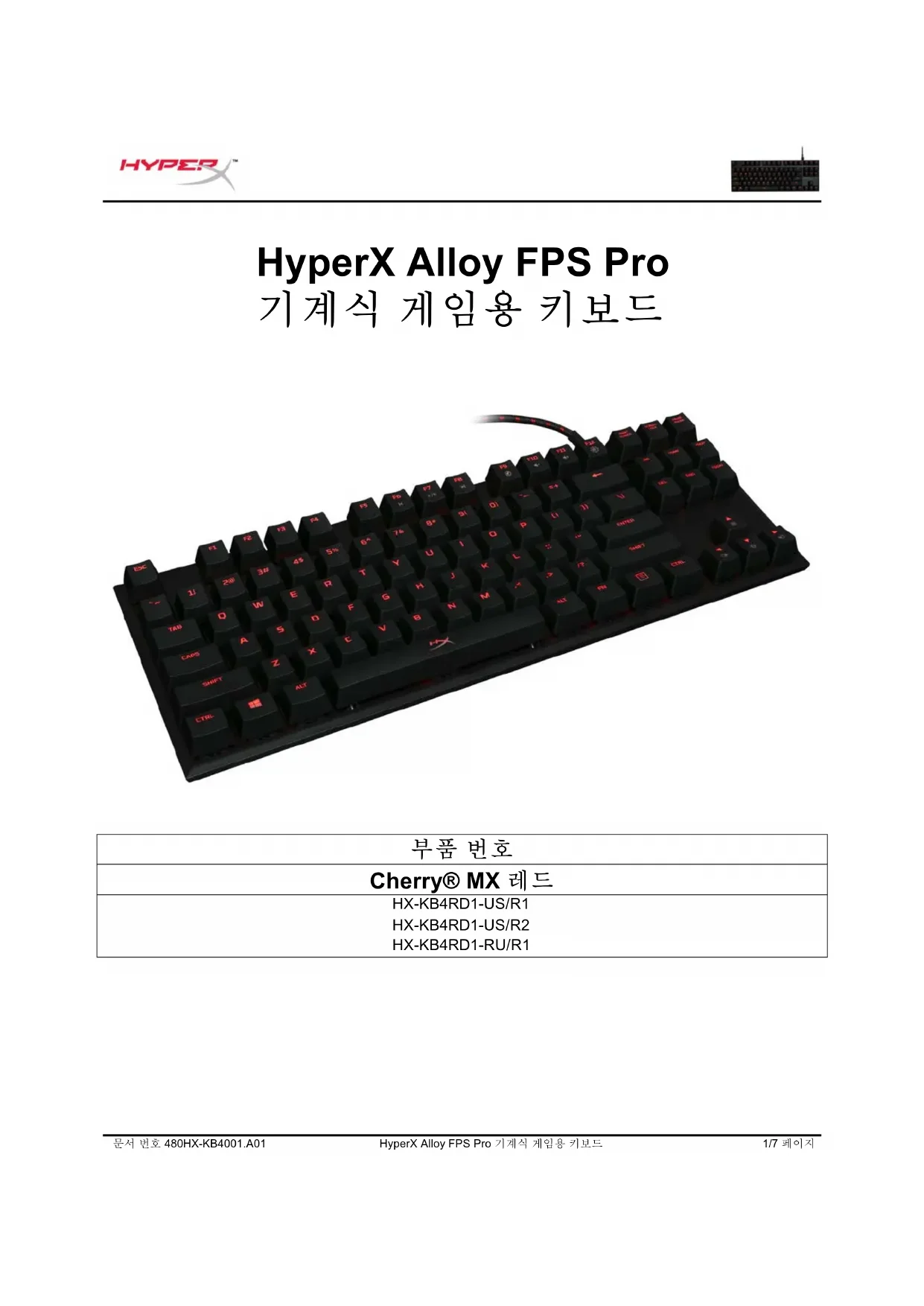Cherry® MX 레드 HX-KB4RD1-US/R1 HX-KB4RD1-US/R2 HX-KB4RD1-RU/R1문서 번호 480HX-KB4001.A01 HyperX Alloy FPS Pro 기계식 게임용 키보드 2/7 페이지