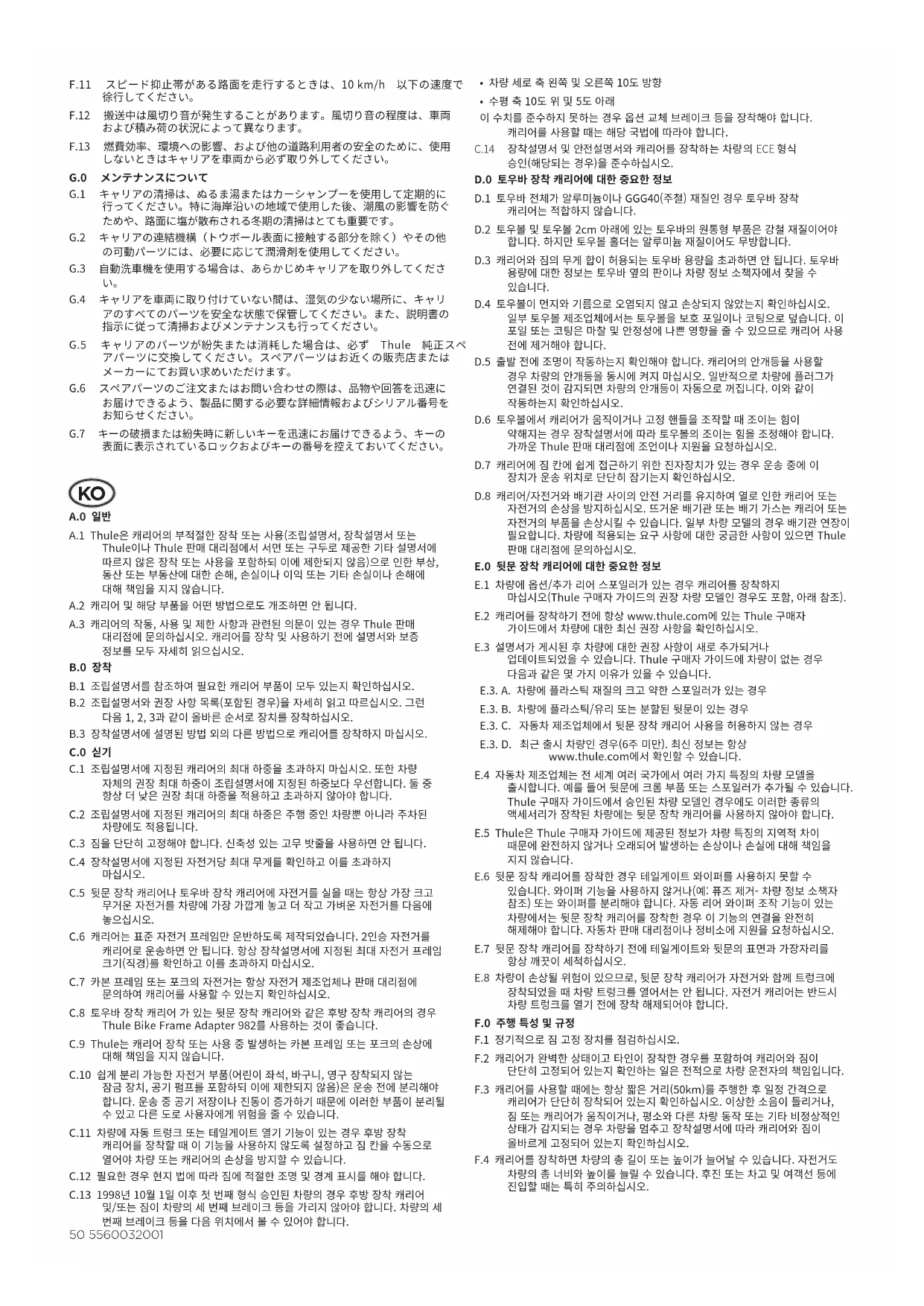 D.4 토우볼이 먼지와 기름으로 오염되지 않고 손상되지 않았는지 확인하십시오. 일부 토우볼 제조업체에서는 토우볼을 보호 포일이나 코팅으로 덮습니다. 이 포일 또는 코팅은 마찰 및 안정성에 나쁜 영향을 줄 수 있으므로 캐리어 사용 전에 제거해야 합니다. D.5 출발 전에 조명이 작동하는지 확인해야 합니다. 캐리어의 안개등을 사용할 경우 차량의 안개등을 동시에 켜지 마십시오. 일반적으로 차량에 플러그가 연결된 것이 감지되면 차량의 안개등이 자동으로 꺼집니다. 이와 같이 작동하는지 확인하십시오. D.6 토우볼에서 캐리어가 움직이거나 고정 핸들을 조작할 때 조이는 힘이 약해지는 경우 장착설명서에 따라 토우볼의 조이는 힘을 조정해야 합니다. 가까운 Thule 판매 대리점에 조언이나 지원을 요청하십시오. D.7 캐리어에 짐 칸에 쉽게 접근하기 위한 진자장치가 있는 경우 운송 중에 이 장치가 운송 위치로 단단히 잠기는지 확인하십시오. D.8 캐리어/자전거와 배기관 사이의 안전 거리를 유지하여 열로 인한 캐리어 또는 자전거의 손상을 방지하십시오. 뜨거운 배기관 또는 배기 가스는 캐리어 또는 자전거의 부품을 손상시킬 수 있습니다. 일부 차량 모델의 경우 배기관 연장이 필요합니다. 차량에 적용되는 요구 사항에 대한 궁금한 사항이 있으면 Thule 판매 대리점에 문의하십시오. E.0 뒷문 장착 캐리어에 대한 중요한 정보 E.1 차량에 옵션/추가 리어 스포일러가 있는 경우 캐리어를 장착하지 마십시오(Thule 구매자 가이드의 권장 차량 모델인 경우도 포함, 아래 참조). E.2 캐리어를 장착하기 전에 항상 www.thule.com에 있는 Thule 구매자 가이드에서 차량에 대한 최신 권장 사항을 확인하십시오. E.3 설명서가 게시된 후 차량에 대한 권장 사항이 새로 추가되거나 업데이트되었을 수 있습니다. Thule 구매자 가이드에 차량이 없는 경우 다음과 같은 몇 가지 이유가 있을 수 있습니다. E.3. A. 차량에 플라스틱 재질의 크고 약한 스포일러가 있는 경우 E.3. B. 차량에 플라스틱/유리 또는 분할된 뒷문이 있는 경우 E.3. C. 자동차 제조업체에서 뒷문 장착 캐리어 사용을 허용하지 않는 경우 E.3. D. 최근 출시 차량인 경우(6주 미만). 최신 정보는 항상 www.thule.com에서 확인할 수 있습니다. E.4 자동차 제조업체는 전 세계 여러 국가에서 여러 가지 특징의 차량 모델을 출시합니다. 예를 들어 뒷문에 크롬 부품 또는 스포일러가 추가될 수 있습니다. Thule 구매자 가이드에서 승인된 차량 모델인 경우에도 이러한 종류의 액세서리가 장착된 차량에는 뒷문 장착 캐리어를 사용하지 않아야 합니다. E.5 Thule은 Thule 구매자 가이드에 제공된 정보가 차량 특징의 지역적 차이 때문에 완전하지 않거나 오래되어 발생하는 손상이나 손실에 대해 책임을