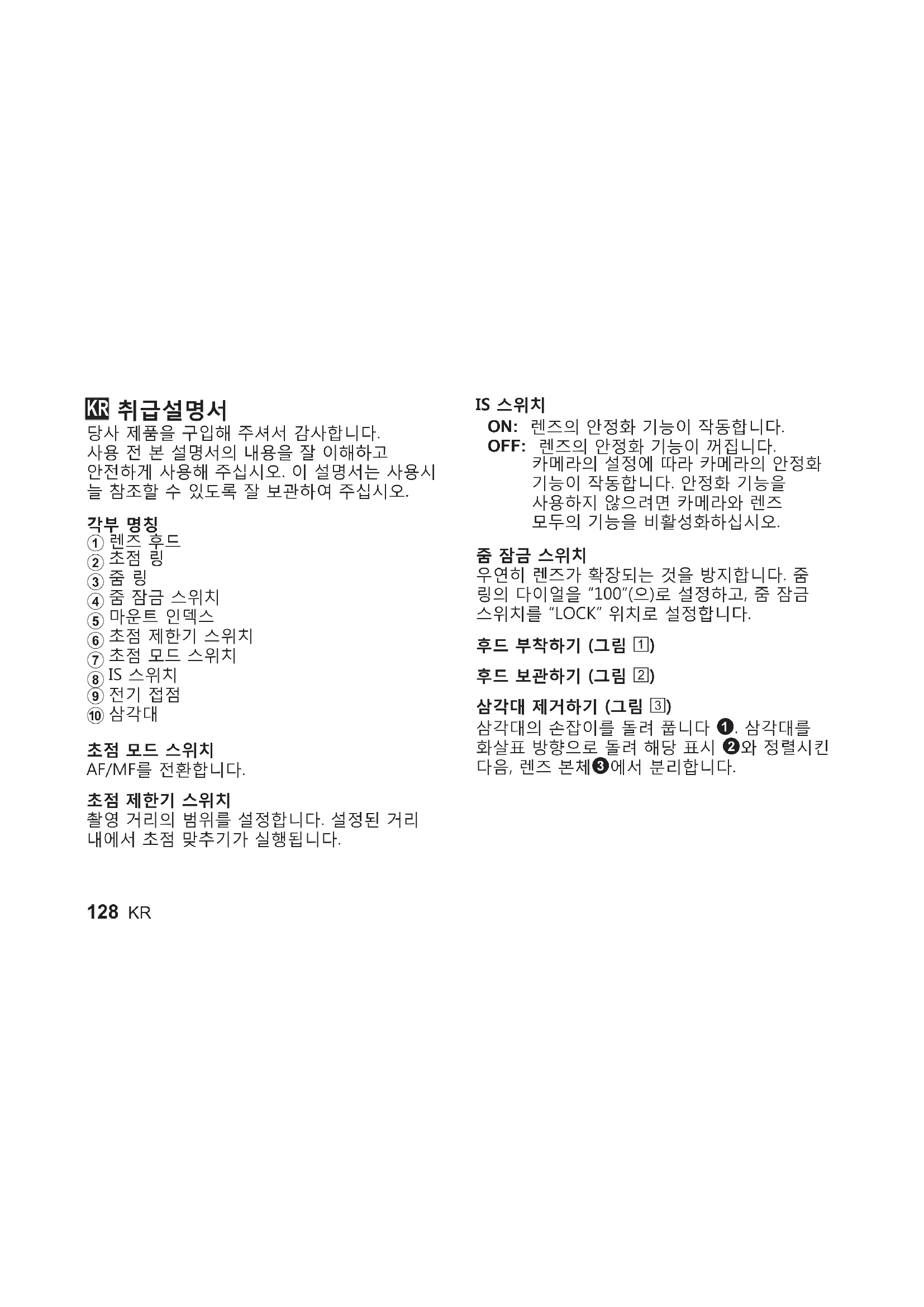 우연히 렌즈가 확장되는 것을 방지합니다. 줌 링의 다이얼을 “100”(으)로 설정하고, 줌 잠금 스위치를 “LOCK” 위치로 설정합니다. 후드 부착하기 (그림 1) 후드 보관하기 (그림 2) 삼각대 제거하기 (그림 3) 삼각대의 손잡이를 돌려 풉니다 1. 삼각대를 화살표 방향으로 돌려 해당 표시 2와 정렬시킨 다음, 렌즈 본체3에서 분리합니다. KRKR 129