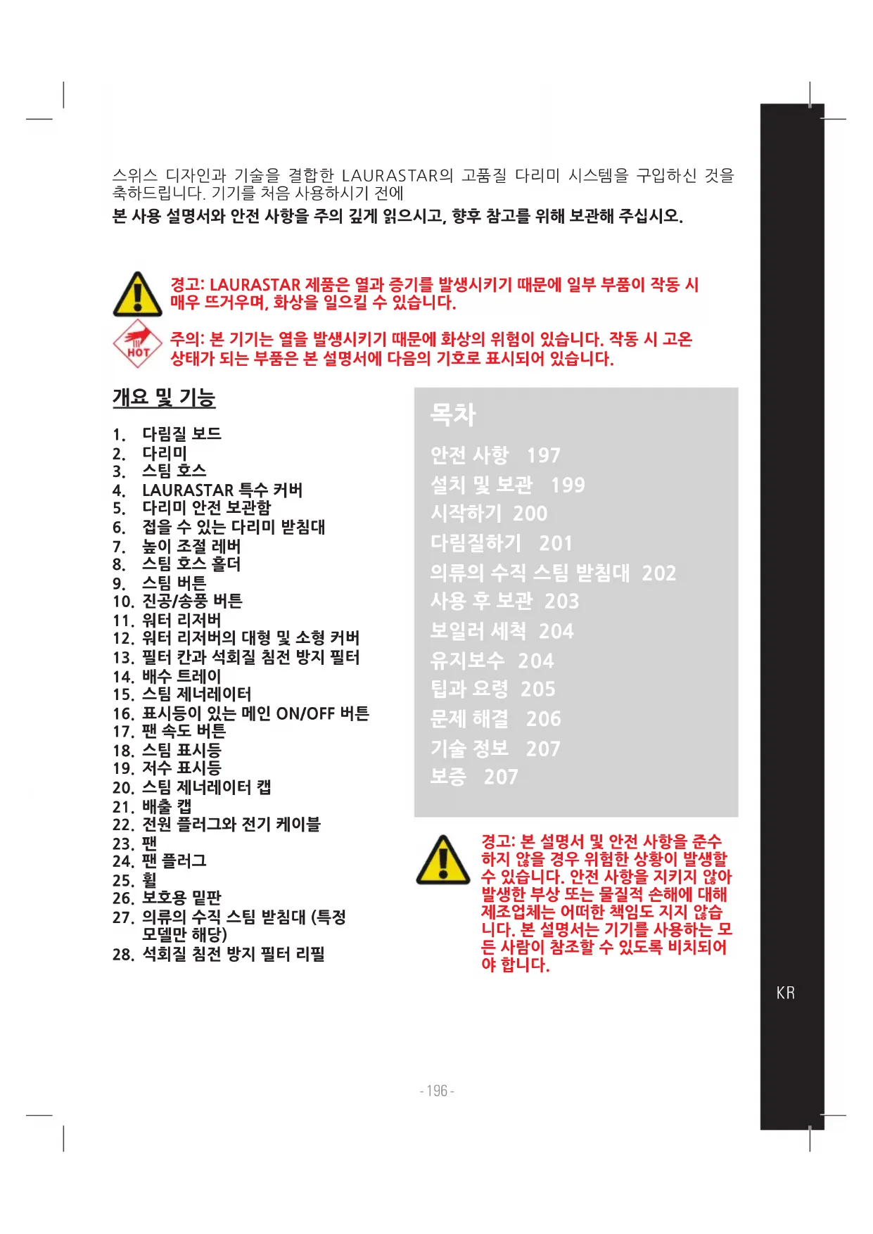 안전 사항 197 설치 및 보관 199 시작하기 200 다림질하기 201 의류의 수직 스팀 받침대 202 사용 후 보관 203 보일러 세척 204 유지보수 204 팁과 요령 205 문제 해결 206 기술 정보 207 보증 207 스위스 디자인과 기술을 결합한 LAURASTAR의 고품질 다리미 시스템을 구입하신 것을 축하드립니다. 기기를 처음 사용하시기 전에 본 사용 설명서와 안전 사항을 주의 깊게 읽으시고, 향후 참고를 위해 보관해 주십시오.