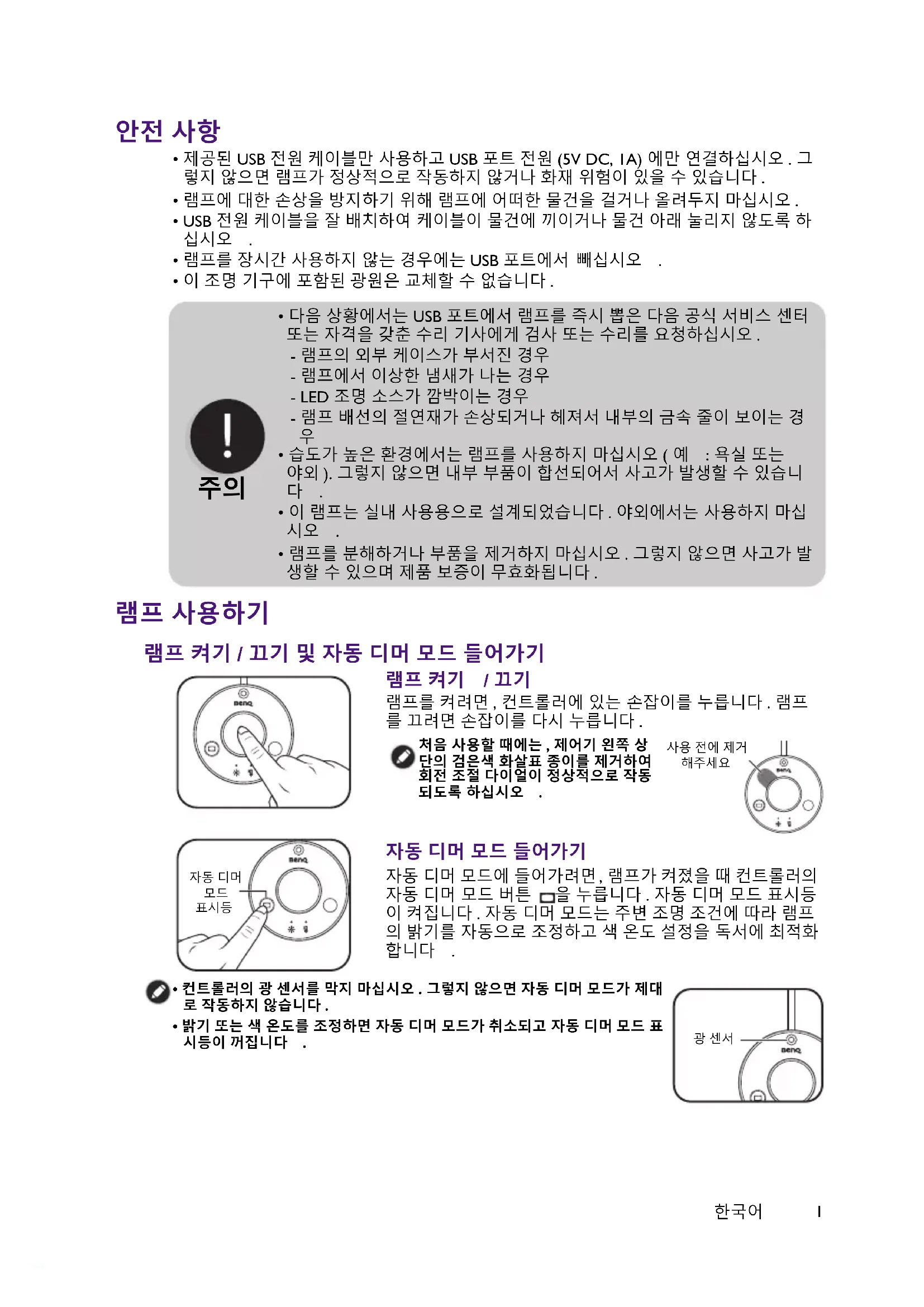 - 제공된 USB 전원 케이블만 사용하고 USB 포트 전원 (5V DC, 1A) 에만 연결하십시오 . 그 렇지 않으면 램프가 정상적으로 작동하지 않거나 화재 위험이 있을 수 있습니다 .