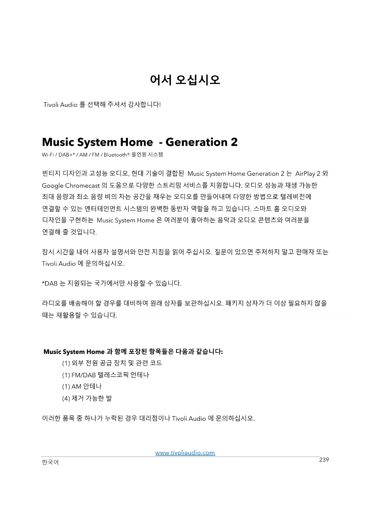 Music System Home - Generation 2 Wi-Fi / DAB+* / AM / FM / Bluetooth® 올인원 시스템 빈티지 디자인과 고성능 오디오, 현대 기술이 결합된 Music System Home Generation 2 는 AirPlay 2 와 Google Chromecast 의 도움으로 다양한 스트리밍 서비스를 지원합니다. 오디오 성능과 재생 가능한 최대 음량과 최소 음량 비의 차는 공간을 채우는 오디오를 만들어내며 다양한 방법으로 텔레비전에 연결할 수 있는 엔터테인먼트 시스템의 완벽한 동반자 역할을 하고 있습니다. 스마트 홈 오디오와 디자인을 구현하는 Music System Home 은 여러분이 좋아하는 음악과 오디오 콘텐츠와 여러분을 연결해 줄 것입니다. 잠시 시간을 내어 사용자 설명서와 안전 지침을 읽어 주십시오. 질문이 있으면 주저하지 말고 판매자 또는 Tivoli Audio 에 문의하십시오. *DAB 는 지원되는 국가에서만 사용할 수 있습니다. 라디오를 배송해야 할 경우를 대비하여 원래 상자를 보관하십시오. 패키지 상자가 더 이상 필요하지 않을 때는 재활용할 수 있습니다.