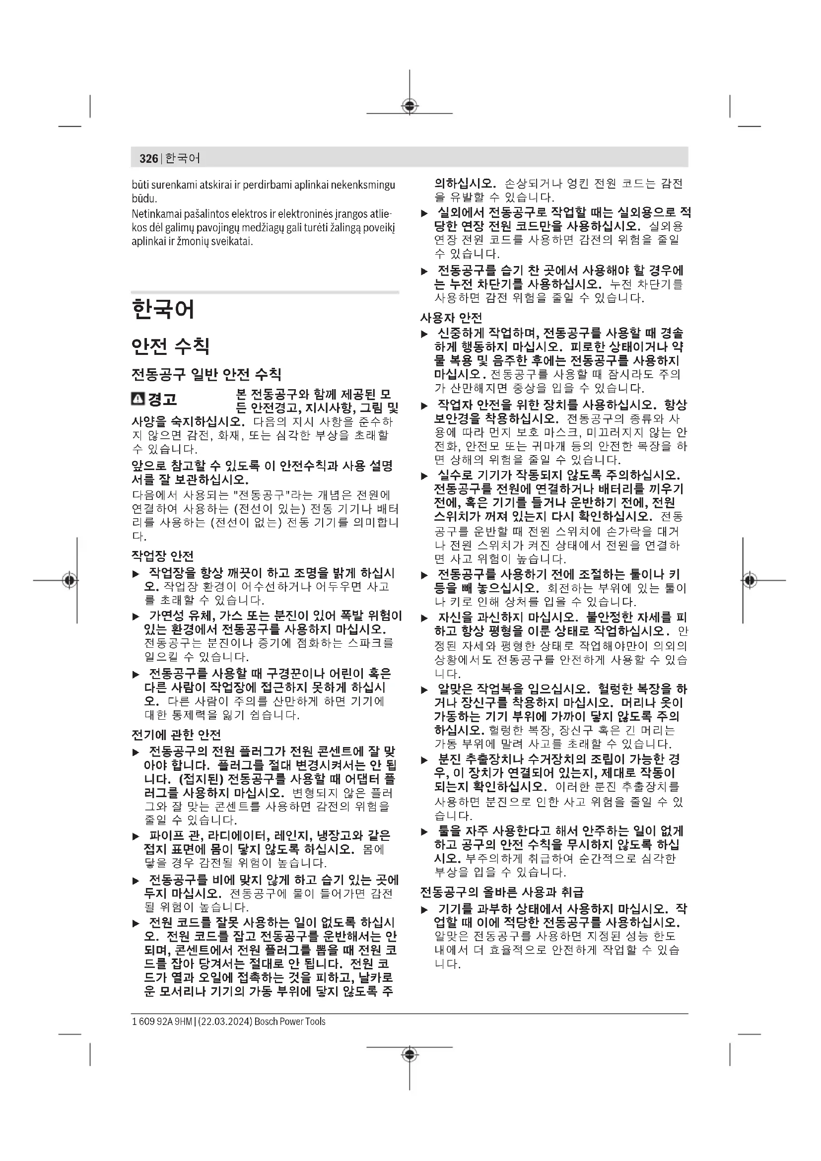 u 액세서리의 외경 및 두께는 공구가 수용할 수 있 는 범위 내에 있어야 합니다. 액세서리의 사이즈 가 부정확한 경우 제대로 보호받지 못하거나 제 어되지 않을 수 있습니다. u 액세서리 장착 치수는 전동공구의 하드웨어 치수 에 맞아야 합니다. 전동공구의 하드웨어에 맞지 않는 액세서리를 장착할 경우 중심을 잃고 과도 하게 진동하며, 통제력을 상실하게 됩니다. u 손상된 액세서리를 사용하지 마십시오. 사용하기 전에 항상 연삭 휠이 깎이거나 갈라지지 않았는 지, 이면 패드가 갈라지거나 또는 찢어지거나 과 도하게 마모되지 않았는지, 와이어 브러시의 와 이어가 느슨하거나 갈라지지 않았는지 액세서리 를 점검하십시오. 전동공구나 액세서리를 떨어뜨 린 경우 손상된 부분이 있는지 확인하고, 손상된 경우 손상되지 않은 액세서리를 설치하십시오. 액세서리를 점검 및 설치한 뒤 회전하는 액세서 리 작업대에서 거리를 멀리 유지하고 전동공구를 1분 간 최대 무부하 속도로 작동시키십시오. 액 세서리가 손상된 경우 일반적으로 테스트 도중에 떨어져 나갈 것입니다. u 신체 보호 장비를 착용하십시오. 용도에 따라 안 면 보호구, 안전 고글 또는 보안경을 착용하십시 오. 필요한 경우, 작은 연삭 파편 또는 가공품 파 편을 막을 수 있는 방진 마스크, 청력 보호구, 장 갑 및 작업용 앞치마를 착용하십시오. 보안경은 여러 작업을 진행하면서 생성되는 비산 파편들을 차단할 수 있어야 합니다. 마스크나 방독 마스크 는 특정 작업을 진행하면서 생성되는 먼지를 걸 러낼 수 있어야 합니다. 오랫동안 고강도의 소음 에 노출되면 청력이 손상될 수 있습니다. u 주변 사람들이 작업 영역으로부터 안전거리를 유 지하게 하십시오. 작업 영역에 진입하는 사람은 모두 신체 보호 장치를 착용해야 합니다. 가공품 또는 손상된 액세서리 파편이 작업 중인 곳을 벗 어나서 날아가 부상을 초래할 수 있습니다. u 절단용 액세서리가 숨겨진 배선 또는 코드를 접 촉할 가능성이 있는 작업을 수행할 경우, 전동공 구의 절연된 손잡이 면만 잡으십시오. 절단용 액 세서리가 "전류가 흐르는" 전선에 접촉되면, 전 동공구의 노출된 금속 부품에 "전류가 흐르는" 상태로 만들어 작업자가 감전될 수 있습니다. u 회전하는 액세서리에 코드가 닿지 않게 하십시 오. 통제력을 잃을 경우, 코드가 잘리거나 감겨 작업자의 손이나 팔이 회전하는 액세서리에 빨려 들어갈 수 있습니다. u 액세서리가 완전히 멈출 때까지 절대 전동공구를 내려 놓지 마십시오. 회전 액세서리가 표면에 달 Bosch Power Tools 1 609 92A 9HM | (22.03.2024)328 | 한국어 라붙어 전동공구를 제어하지 못하게 될 수 있습