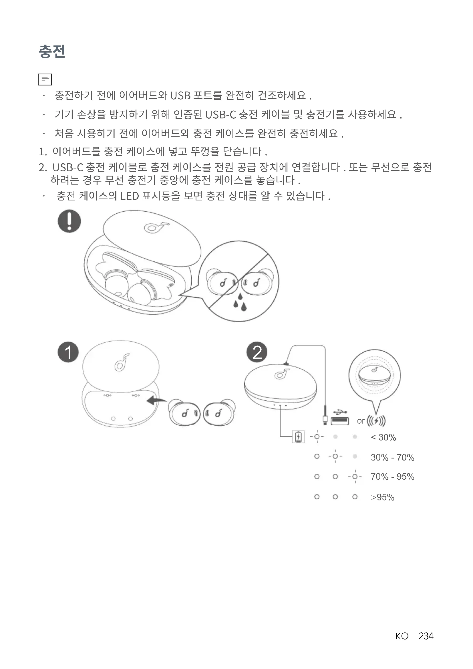 - 충전하기 전에 이어버드와USB포트를 완전히 건조하세요 .