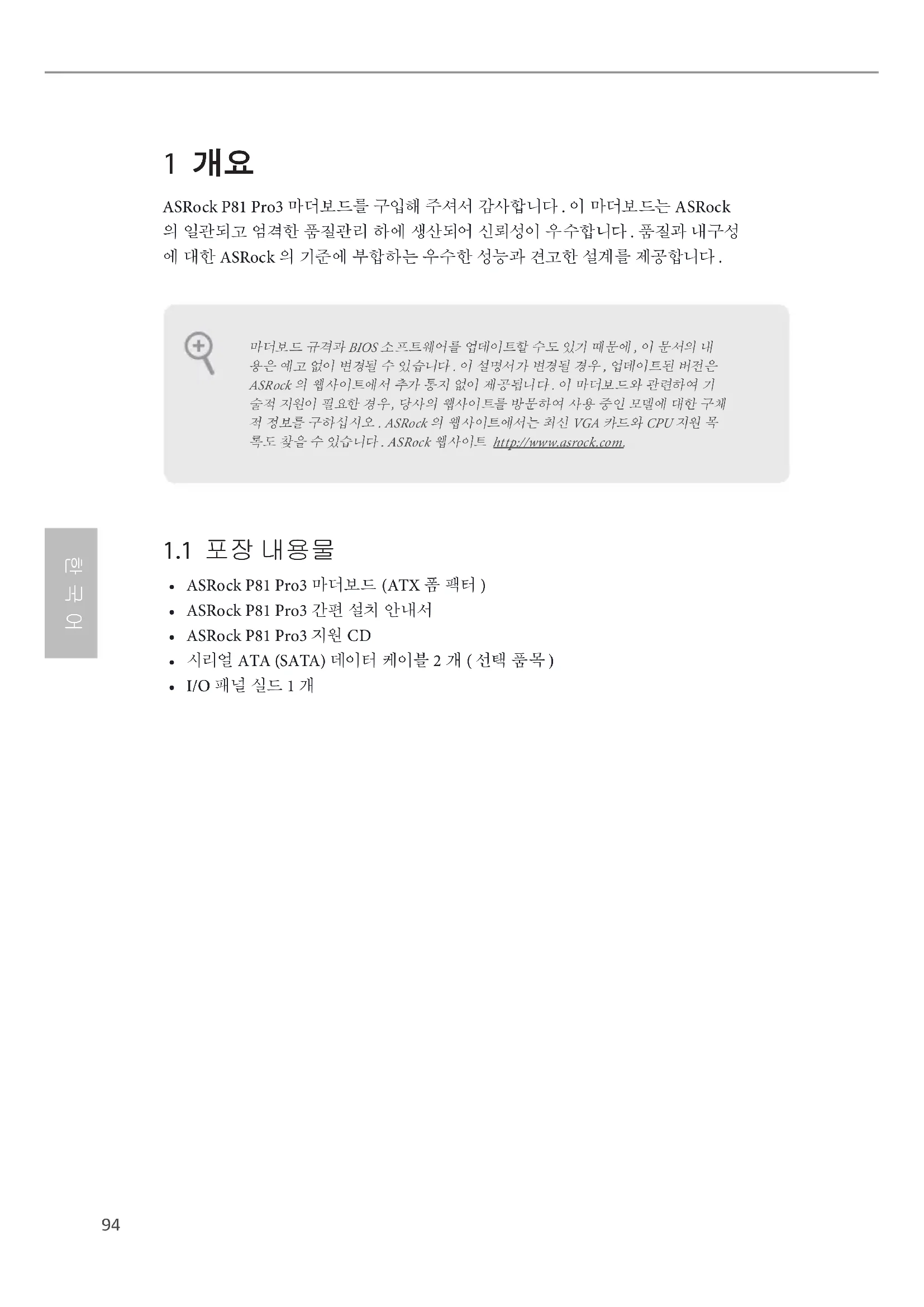 - I/O 패널 실드 1 개 마더보드 규격과 BIOS 소프트웨어를 업데이트할 수도 있기 때문에 , 이 문서의 내 용은 예고 없이 변경될 수 있습니다 . 이 설명서가 변경될 경우 , 업데이트된 버전은 ASRock 의 웹사이트에서 추가 통지 없이 제공됩니다 . 이 마더보드와 관련하여 기 술적 지원이 필요한 경우 , 당사의 웹사이트를 방문하여 사용 중인 모델에 대한 구체 적 정보를 구하십시오 . ASRock 의 웹사이트에서는 최신 VGA 카드와 CPU 지원 목 록도 찾을 수 있습니다 . ASRock 웹사이트 http://www.asrock.com.P81 Pro3