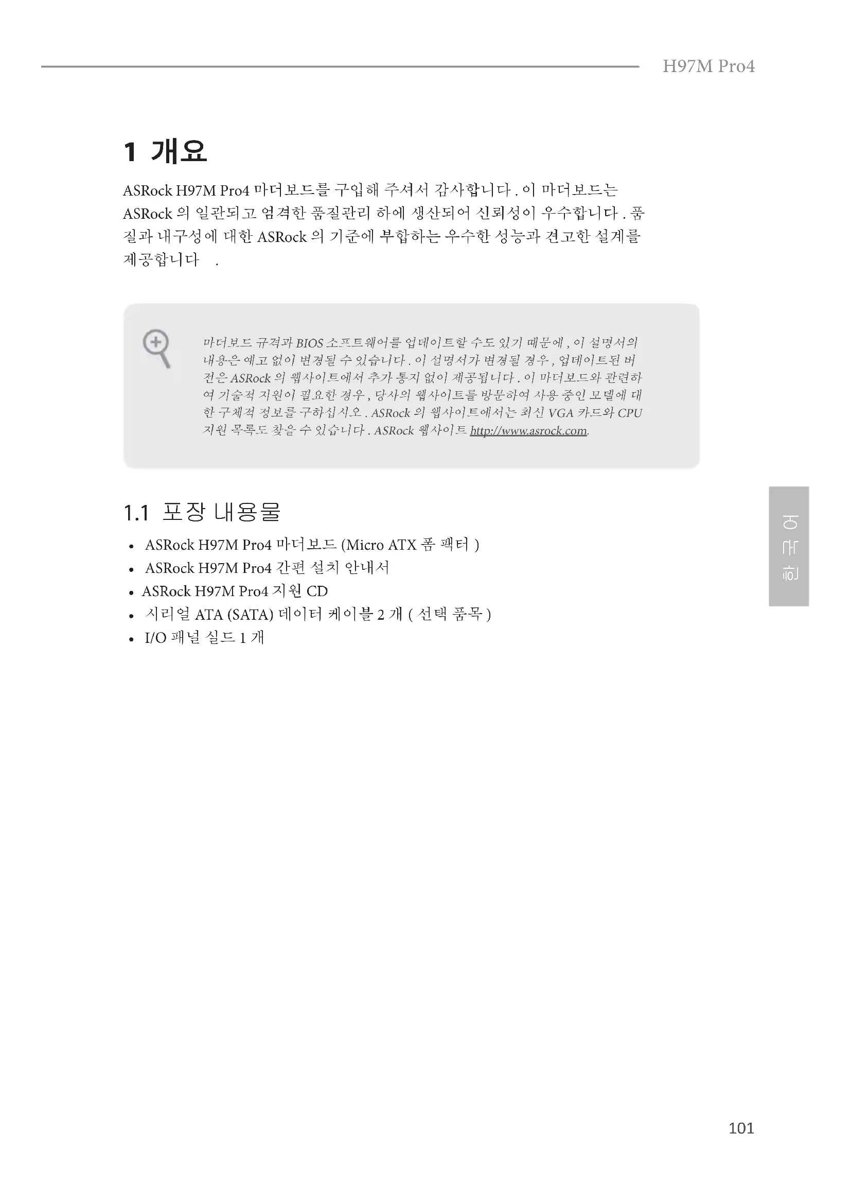 H97M Pro4 1 개요 ASRock H97M Pro4 마더보드를 구입해 주셔서 감사합니다 . 이 마더보드는 ASRock 의 일관되고 엄격한 품질관리 하에 생산되어 신뢰성이 우수합니다 . 품 질과 내구성에 대한 ASRock 의 기준에 부합하는 우수한 성능과 견고한 설계를