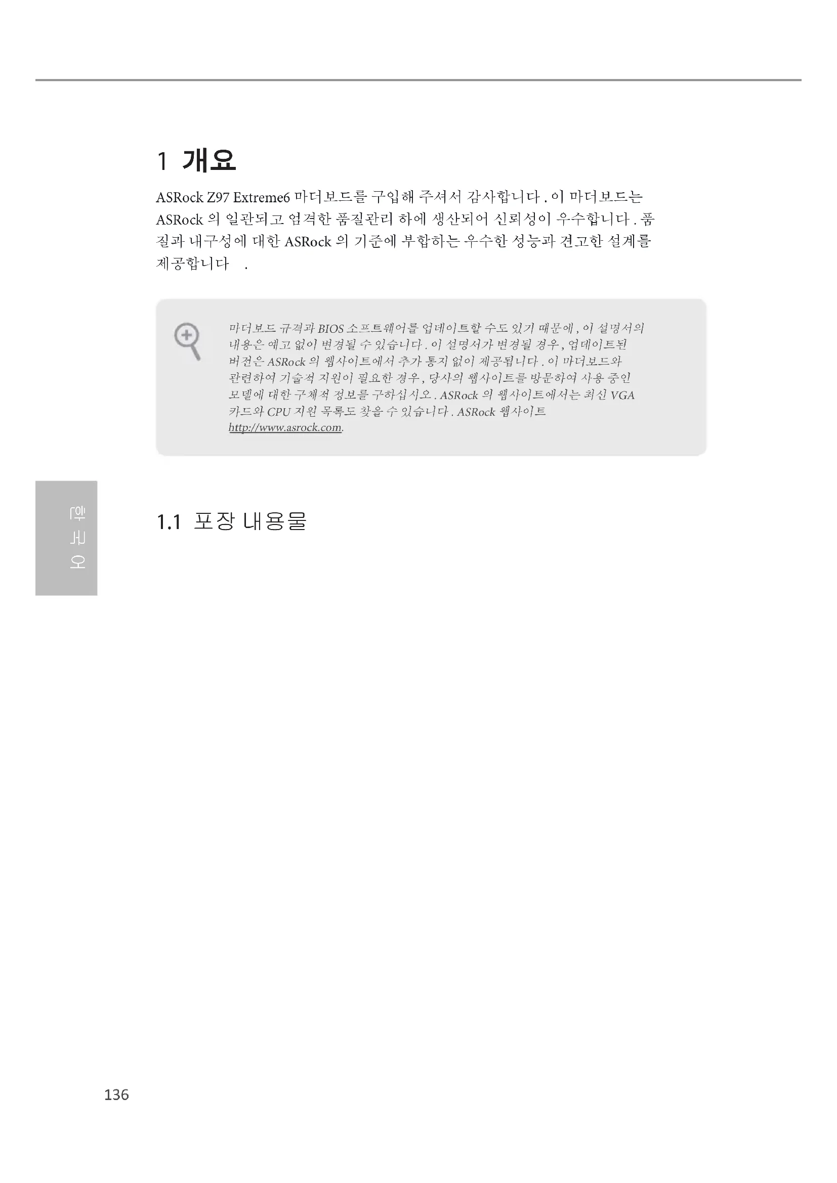 1 개요 ASRock Z97 Extreme6 마더보드를 구입해 주셔서 감사합니다 . 이 마더보드는 ASRock 의 일관되고 엄격한 품질관리 하에 생산되어 신뢰성이 우수합니다 . 품 질과 내구성에 대한 ASRock 의 기준에 부합하는 우수한 성능과 견고한 설계를