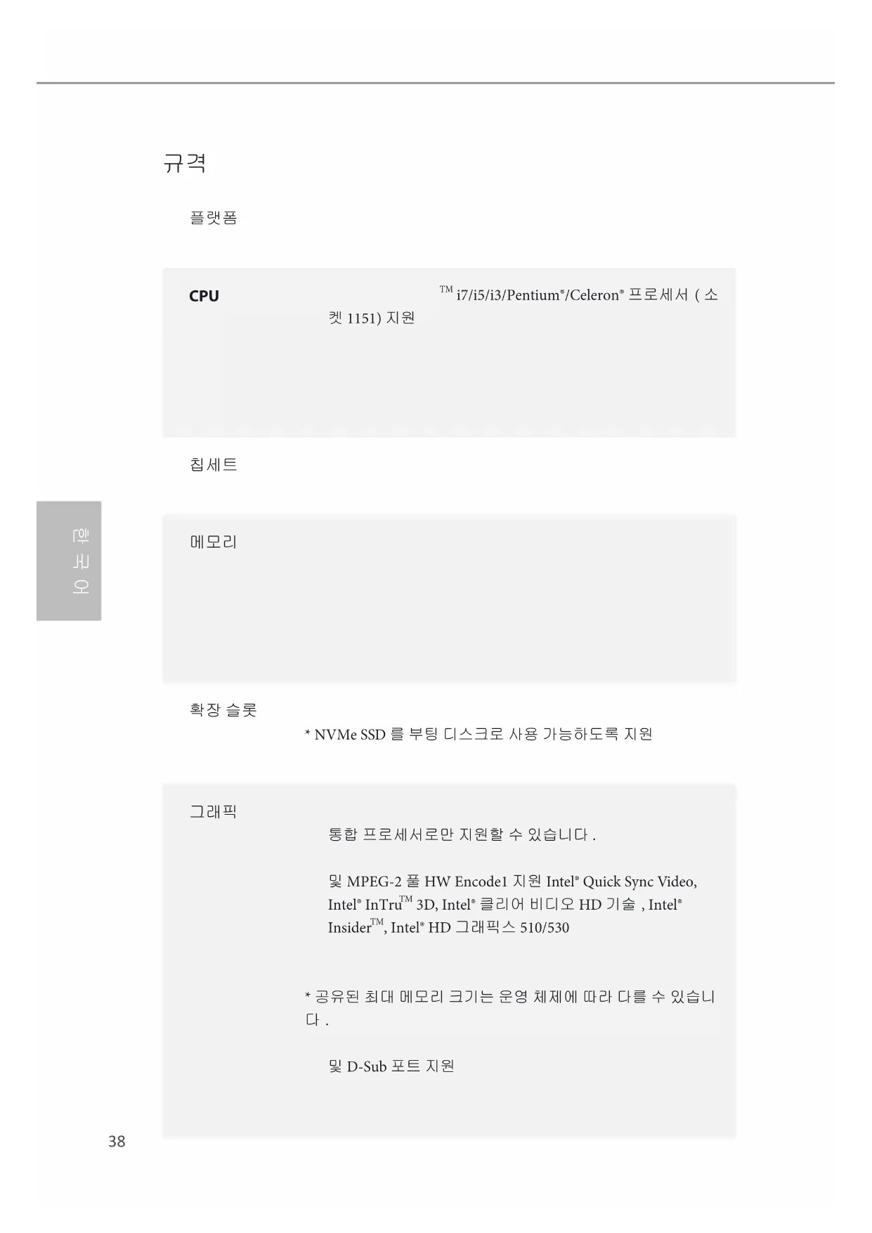 - Intel® HD 그래픽스 빌트 - 인 비주얼과 VGA 출력은 GPU 통합 프로세서로만 지원할 수 있습니다 .