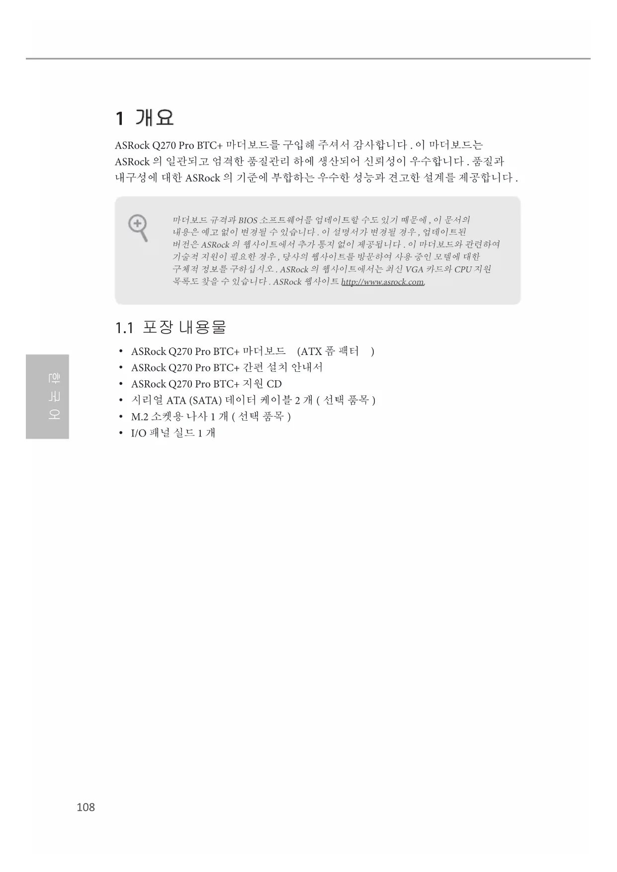 1 개요 ASRock Q270 Pro BTC+ 마더보드를 구입해 주셔서 감사합니다 . 이 마더보드는 ASRock 의 일관되고 엄격한 품질관리 하에 생산되어 신뢰성이 우수합니다 . 품질과 내구성에 대한 ASRock 의 기준에 부합하는 우수한 성능과 견고한 설계를 제공합니다 . 마더보드 규격과 BIOS 소프트웨어를 업데이트할 수도 있기 때문에 , 이 문서의 내용은 예고 없이 변경될 수 있습니다 . 이 설명서가 변경될 경우 , 업데이트된 버전은 ASRock 의 웹사이트에서 추가 통지 없이 제공됩니다 . 이 마더보드와 관련하여 기술적 지원이 필요한 경우 , 당사의 웹사이트를 방문하여 사용 중인 모델에 대한 구체적 정보를 구하십시오 . ASRock 의 웹사이트에서는 최신 VGA 카드와 CPU 지원 목록도 찾을 수 있습니다 . ASRock 웹사이트 http://www.asrock.com.