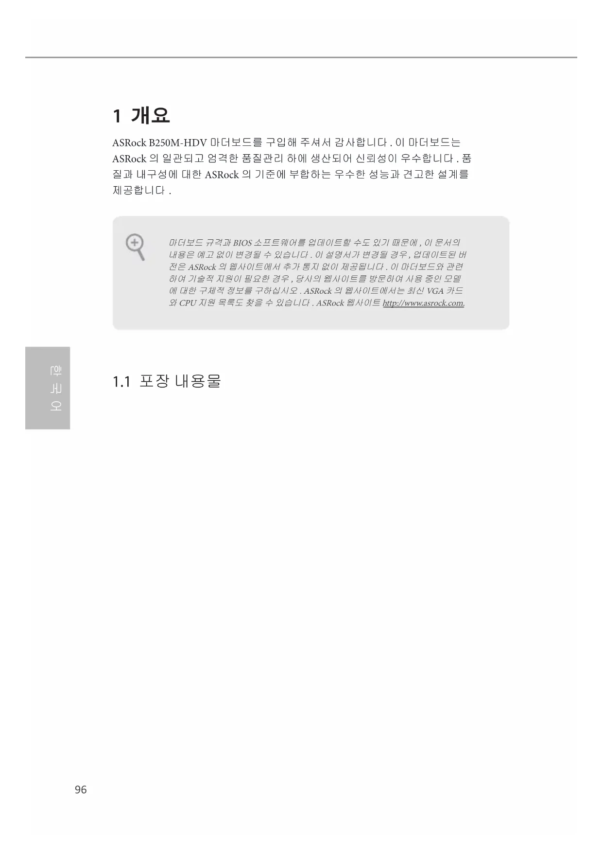 - I/O 패널 실드 1 개 마더보드 규격과 BIOS 소프트웨어를 업데이트할 수도 있기 때문에 , 이 문서의 내용은 예고 없이 변경될 수 있습니다 . 이 설명서가 변경될 경우 , 업데이트된 버 전은 ASRock 의 웹사이트에서 추가 통지 없이 제공됩니다 . 이 마더보드와 관련 하여 기술적 지원이 필요한 경우 , 당사의 웹사이트를 방문하여 사용 중인 모델 에 대한 구체적 정보를 구하십시오 . ASRock 의 웹사이트에서는 최신 VGA 카드 와 CPU 지원 목록도 찾을 수 있습니다 . ASRock 웹사이트 http://www.asrock.com.97 B250M-HDV