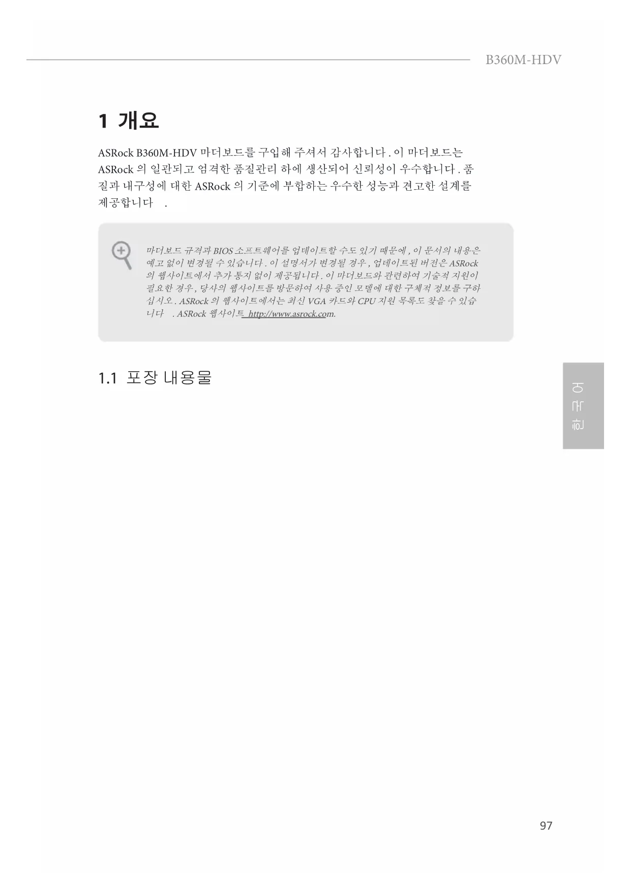 1 개요 ASRock B360M-HDV 마더보드를 구입해 주셔서 감사합니다 . 이 마더보드는 ASRock 의 일관되고 엄격한 품질관리 하에 생산되어 신뢰성이 우수합니다 . 품 질과 내구성에 대한 ASRock 의 기준에 부합하는 우수한 성능과 견고한 설계를